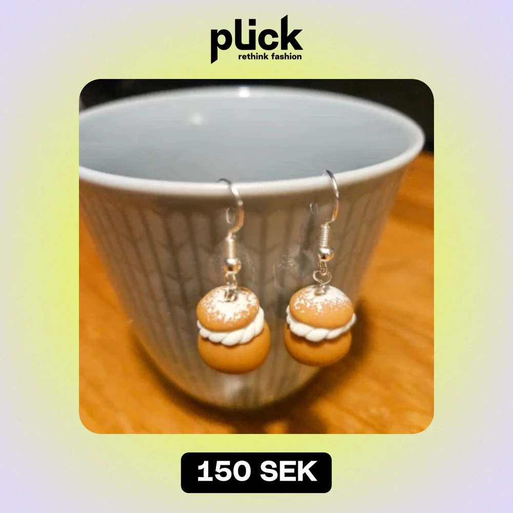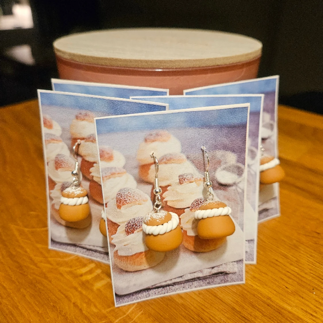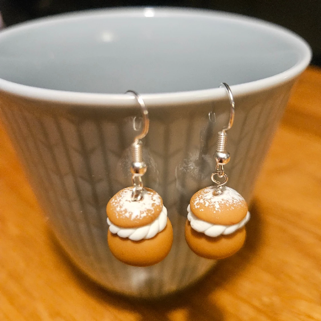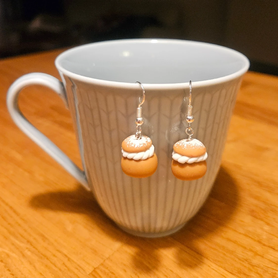 Örhängen föreställande semlor. Totalt finns fem par till salu. Då de är hemmagjorda, är de alla individuella. Pris: 150 kr inkl porto (frimärke Post Nord)