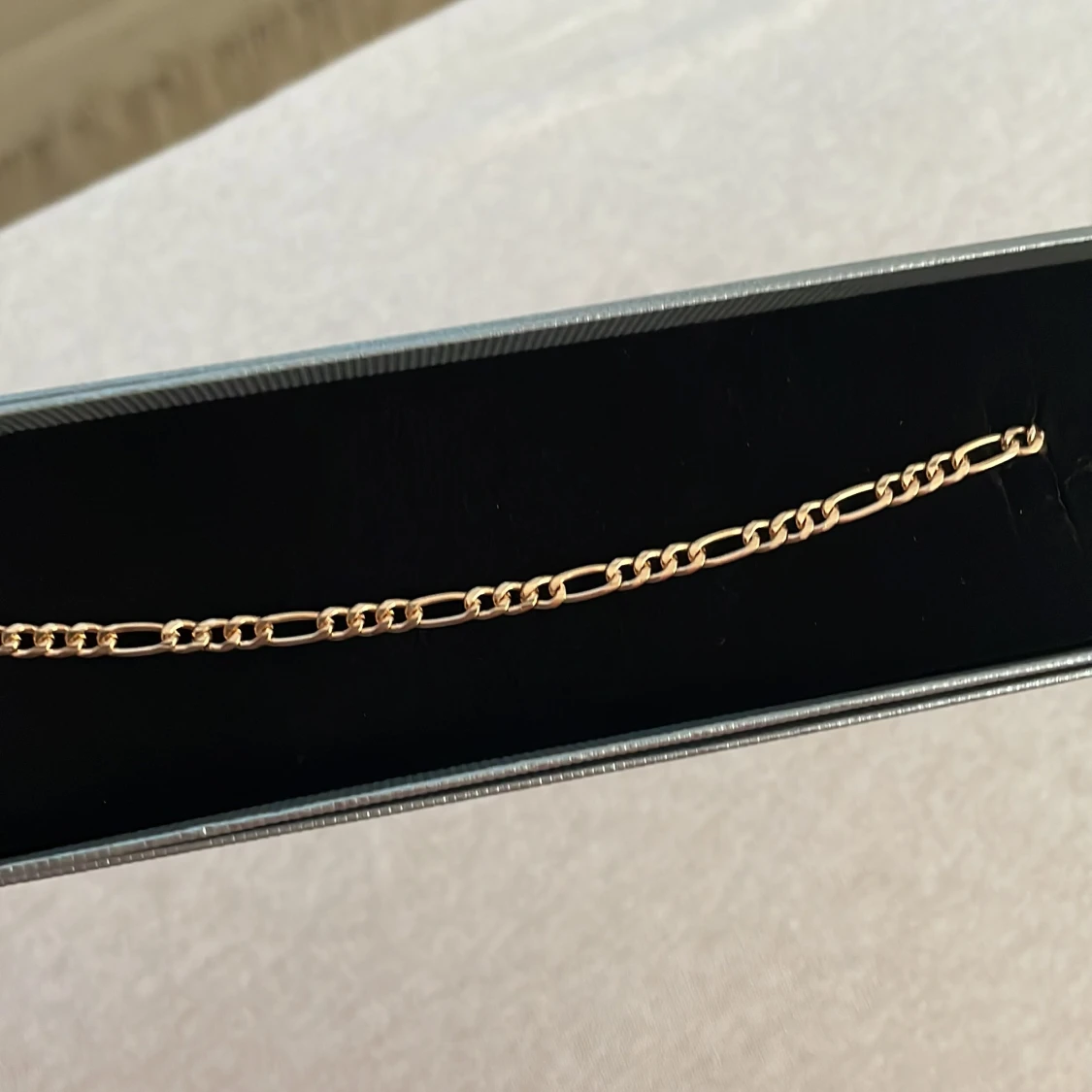 Figarohalsband som är oanvänt. Oklart vilket material det är, kan vara allt från guld till silver till en bijouteri, ingen aning. Det är oanvänd därav 400kr + 19kr frakt.