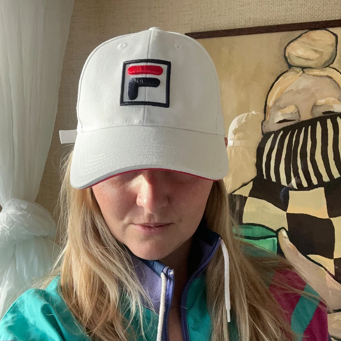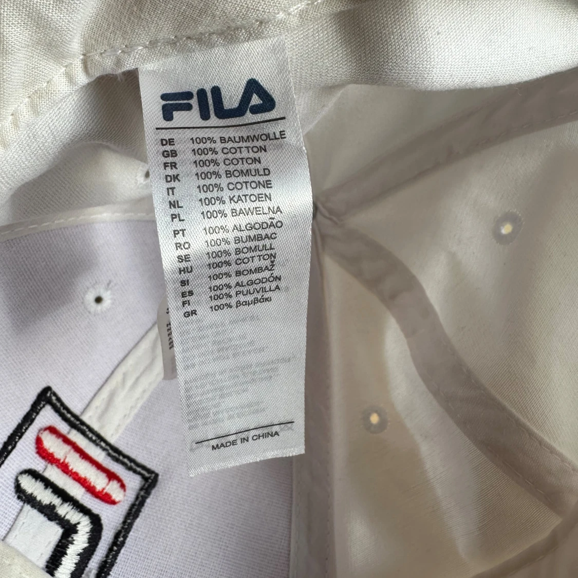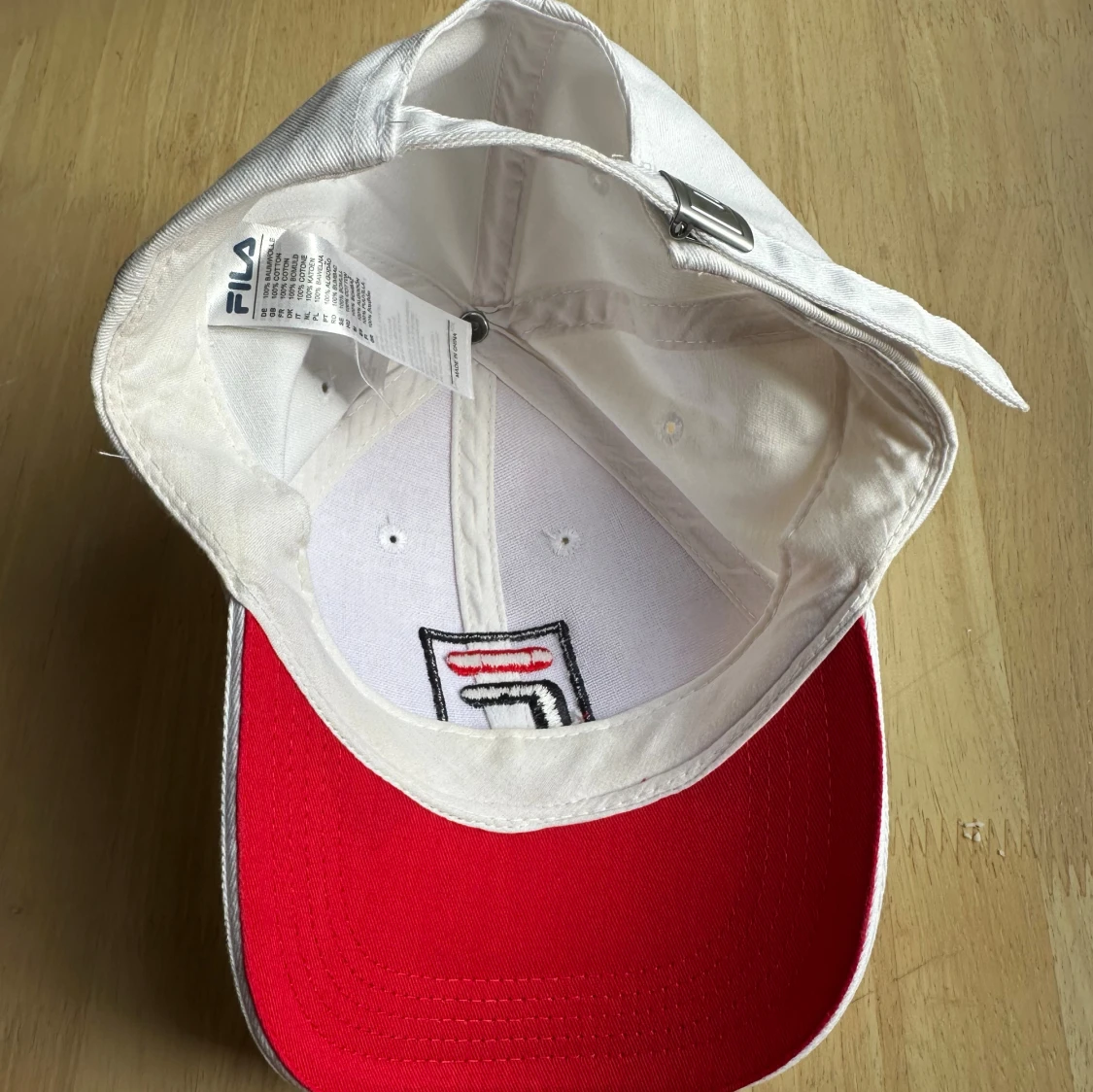 Snygg vit keps från FILA med broderad logga i svart och rött framtill. Kepsen har böjd skärm och justerbar rem baktill. Insidan av skärmen är röd för extra kontrast. Tillverkad i 100% bomull. Kepsen är i nyskick!