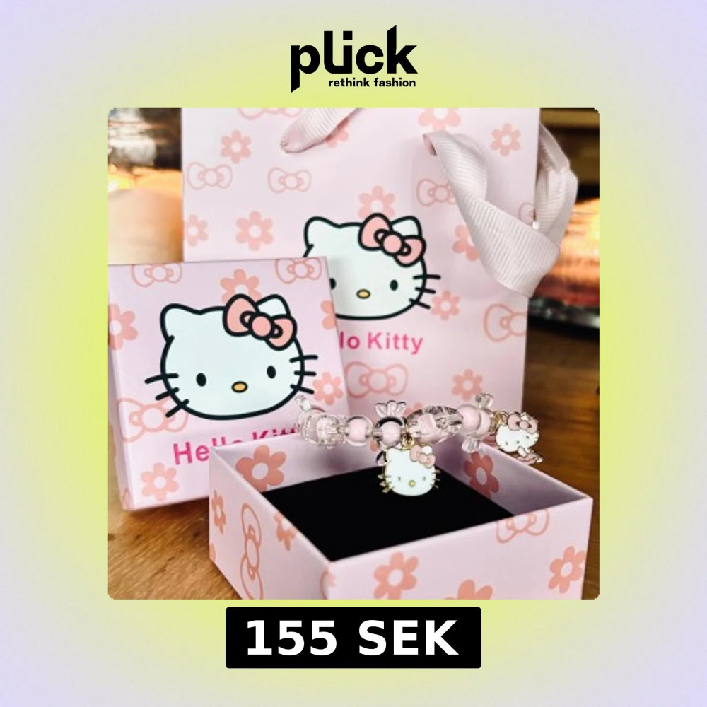 Fint elastiskt armband med rosa pärlor och Hello Kitty-berlocker. Kommer i fin ask med matchande presentpåse. Nytt och oanvänt.