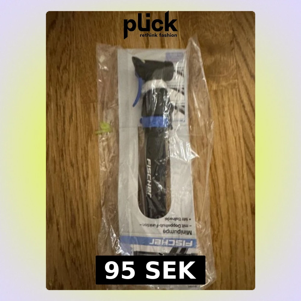 Säljer en kompakt minipump från Fischer i svart och blå plast. Perfekt att ha med sig i väskan eller ryggsäcken när du cyklar. Pumpen har ergonomiskt handtag och passar både bil- och cykelventil. Enkel att använda och smidig att ta med.