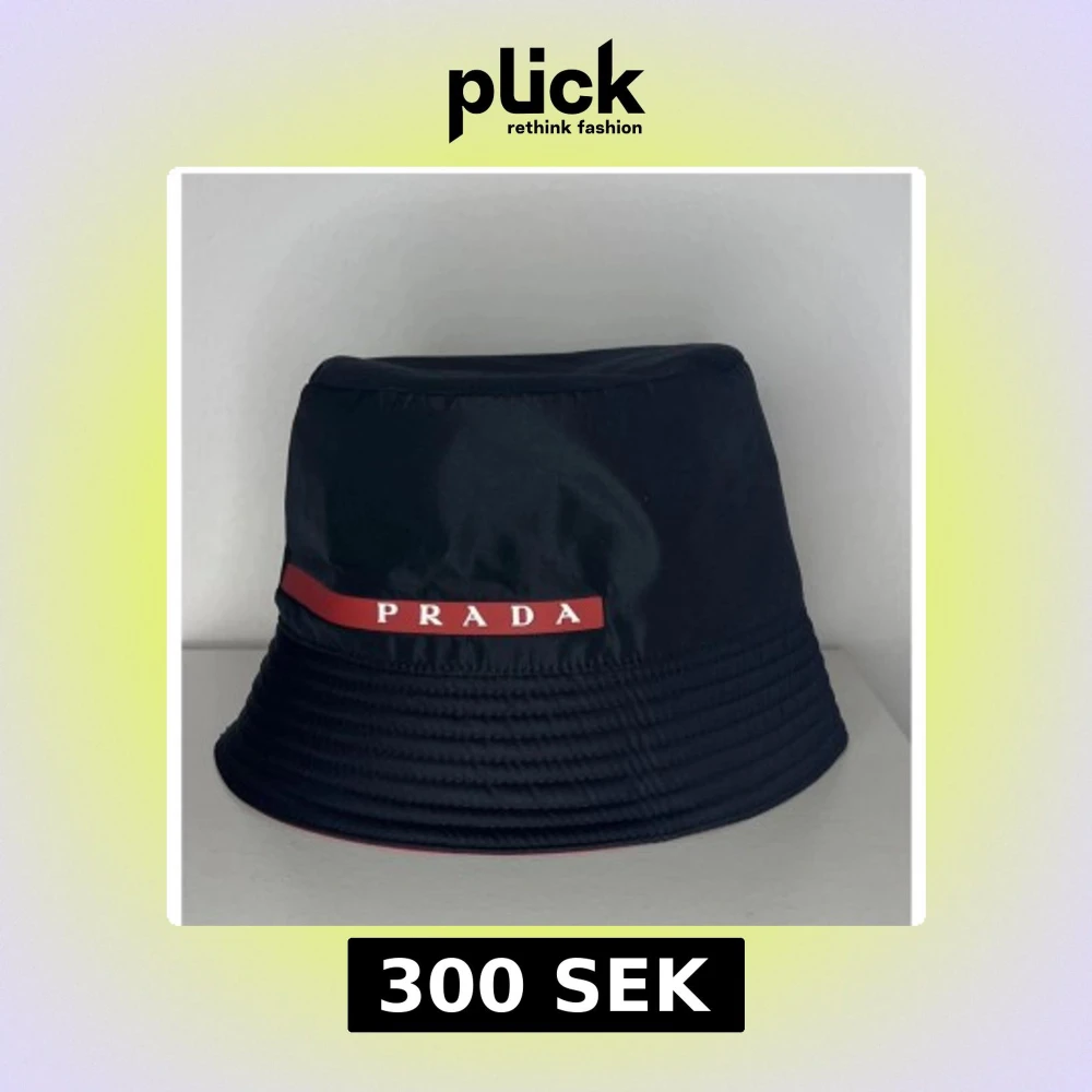 svart bucket hat från Prada med röd logotypdetalj. Helt ny, priset går att diskutera
