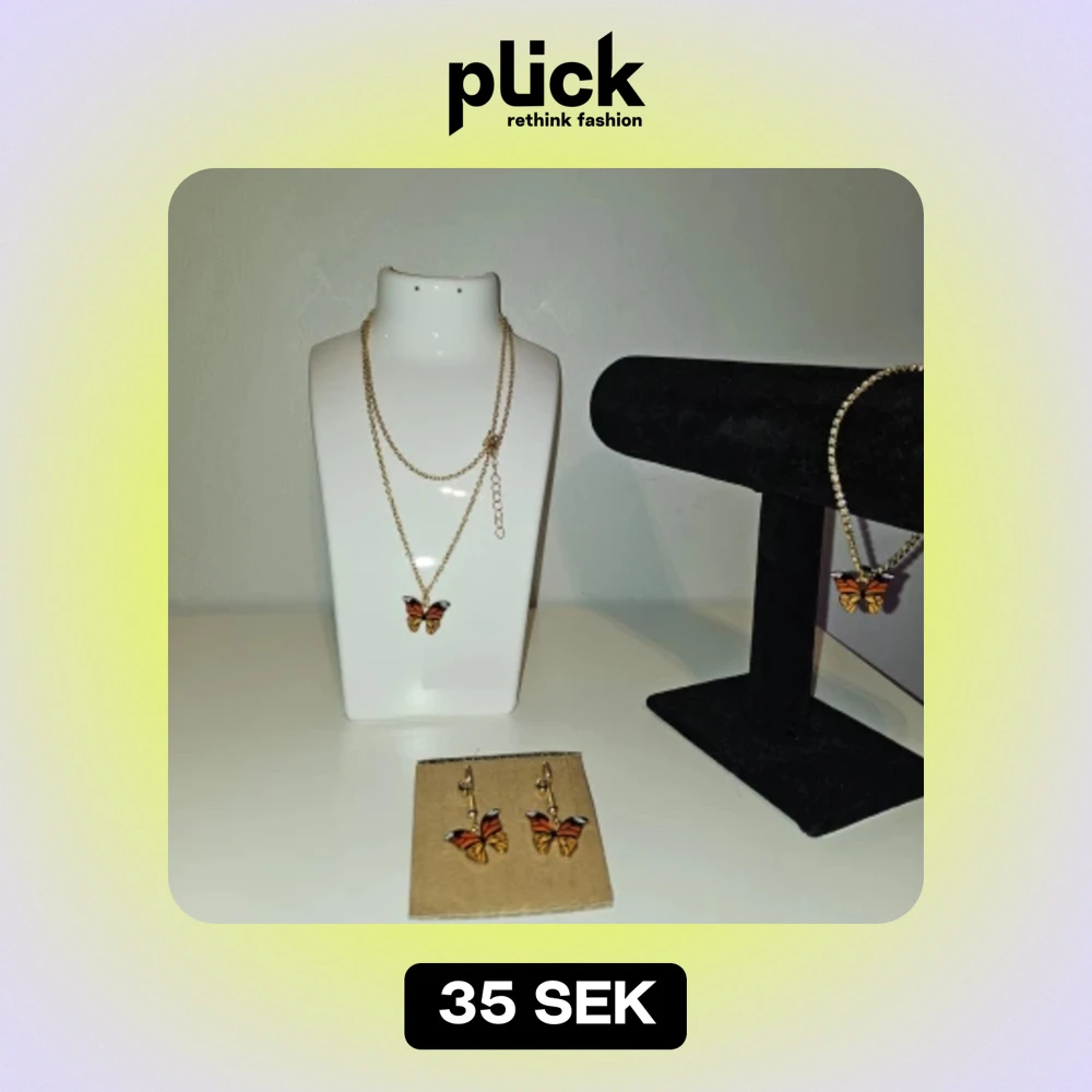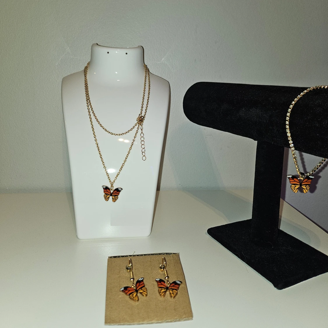 Armband, halsband och örhänge med fjärilar på, aldrig använda.
