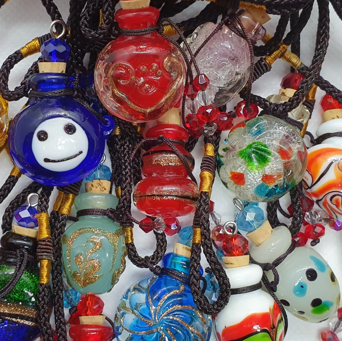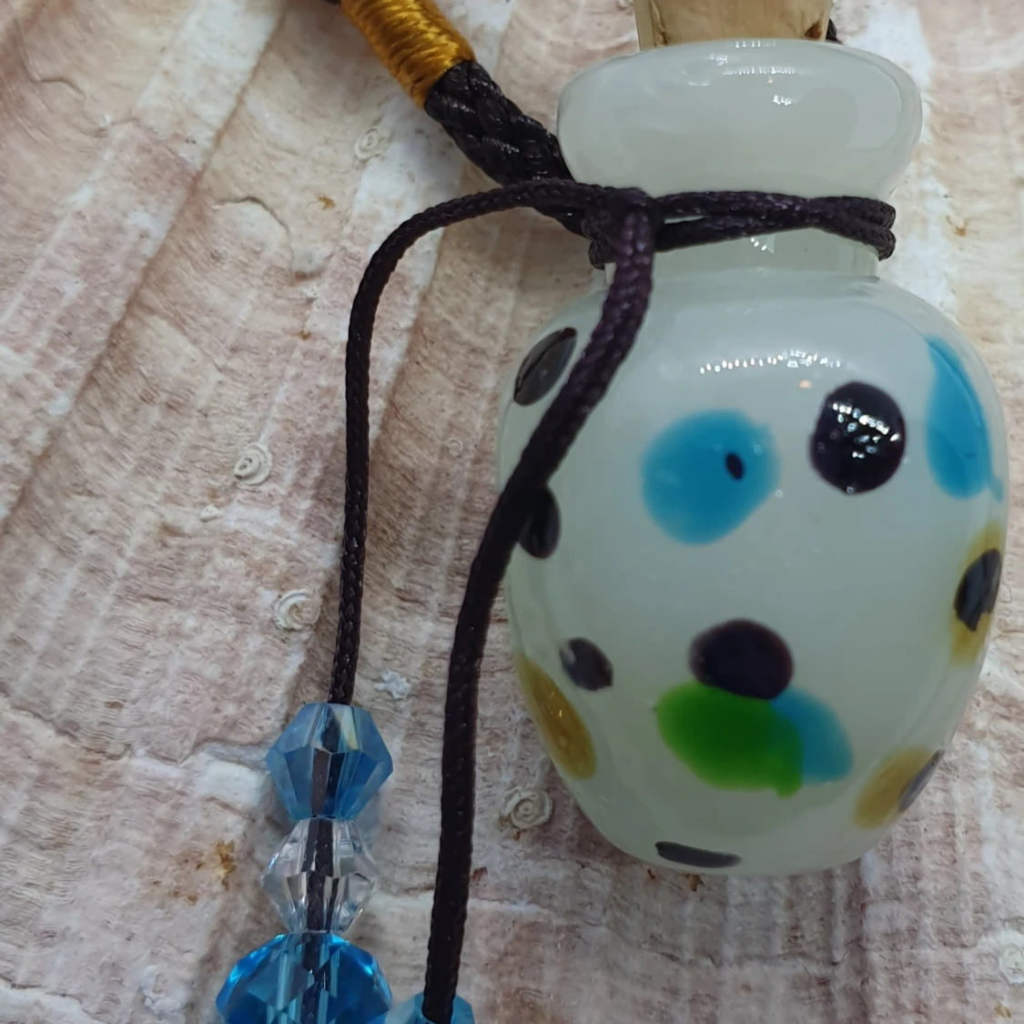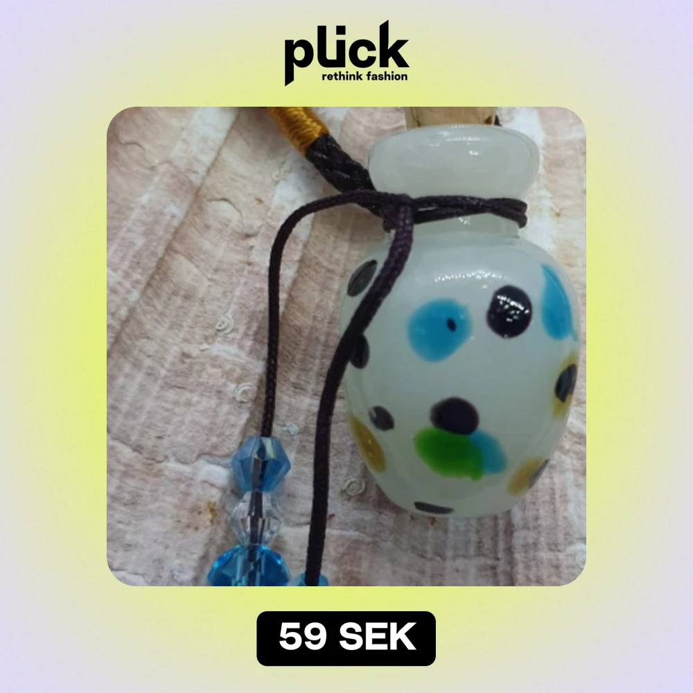 Målad & pyntad flaska (ca 4cm) i porslin/glas, ställbart band 48-65cm. Ha den som halsband, backspegelshänge, eller prydnad, fyll med parfym. Titta igenom mina upplagda & köp fler saker i bundle för att spara på frakt & få allt du köpt i samma paket