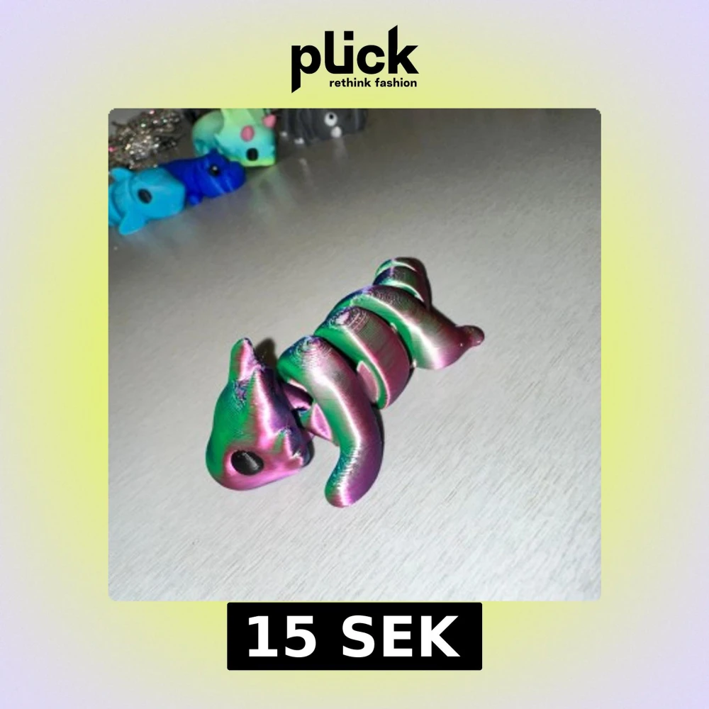 En unik flerfärgad figur med en spiralformad kropp. Den har en metallisk yta som skiftar i grönt, rosa och lila. Figuren har en kattliknande form med stora ögon och en kompakt design.