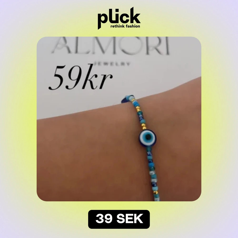 Ett armband med små pärlor i olika färger, inklusive blå, guld och turkos. Armbandet har ett centralt öga som detalj.