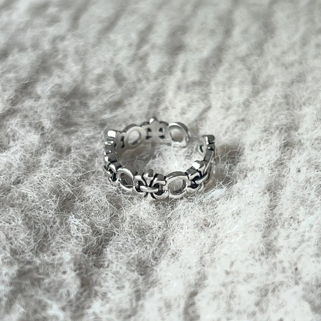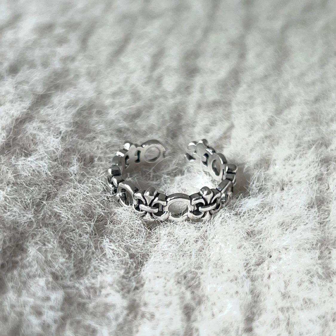 Delicate, adjustable ring with a seamless fleur-de-lis pattern. Classic and versatile.