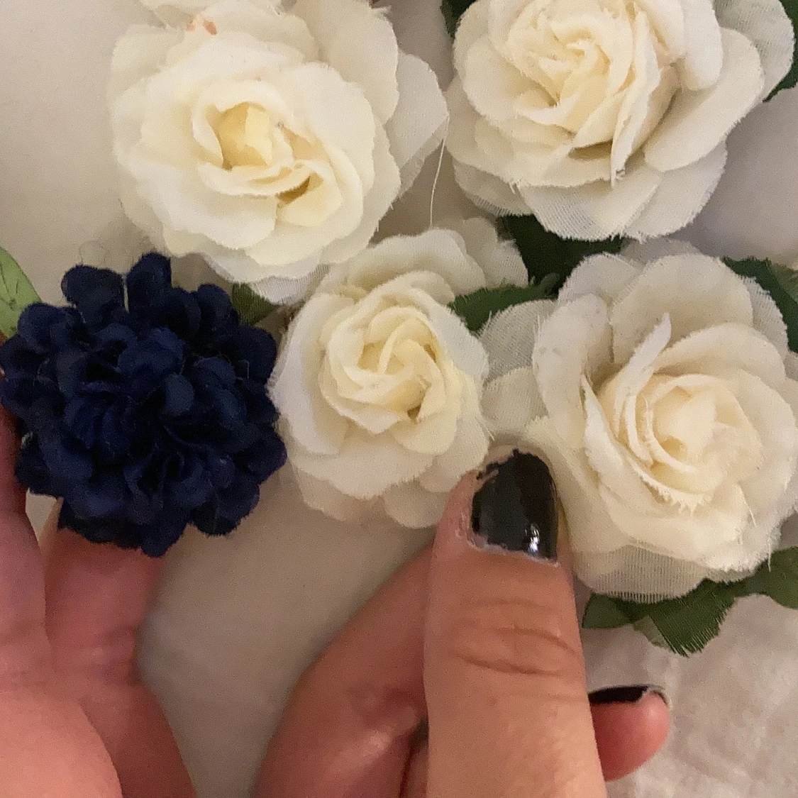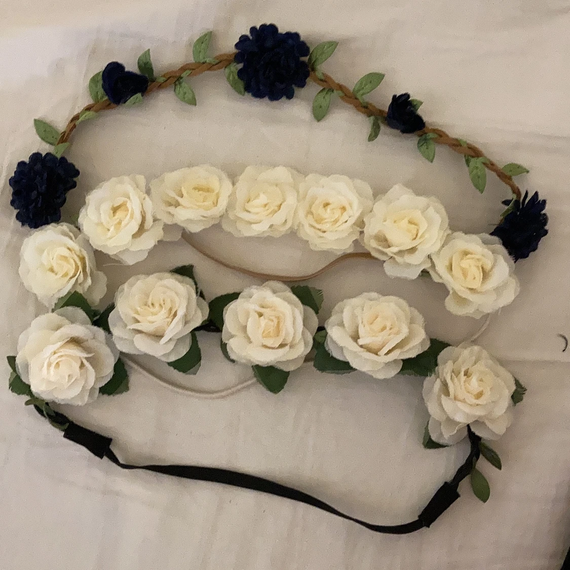 Tre somriga hårband med blommor på. En mörkblå med blad, en vit utan blad och en med.