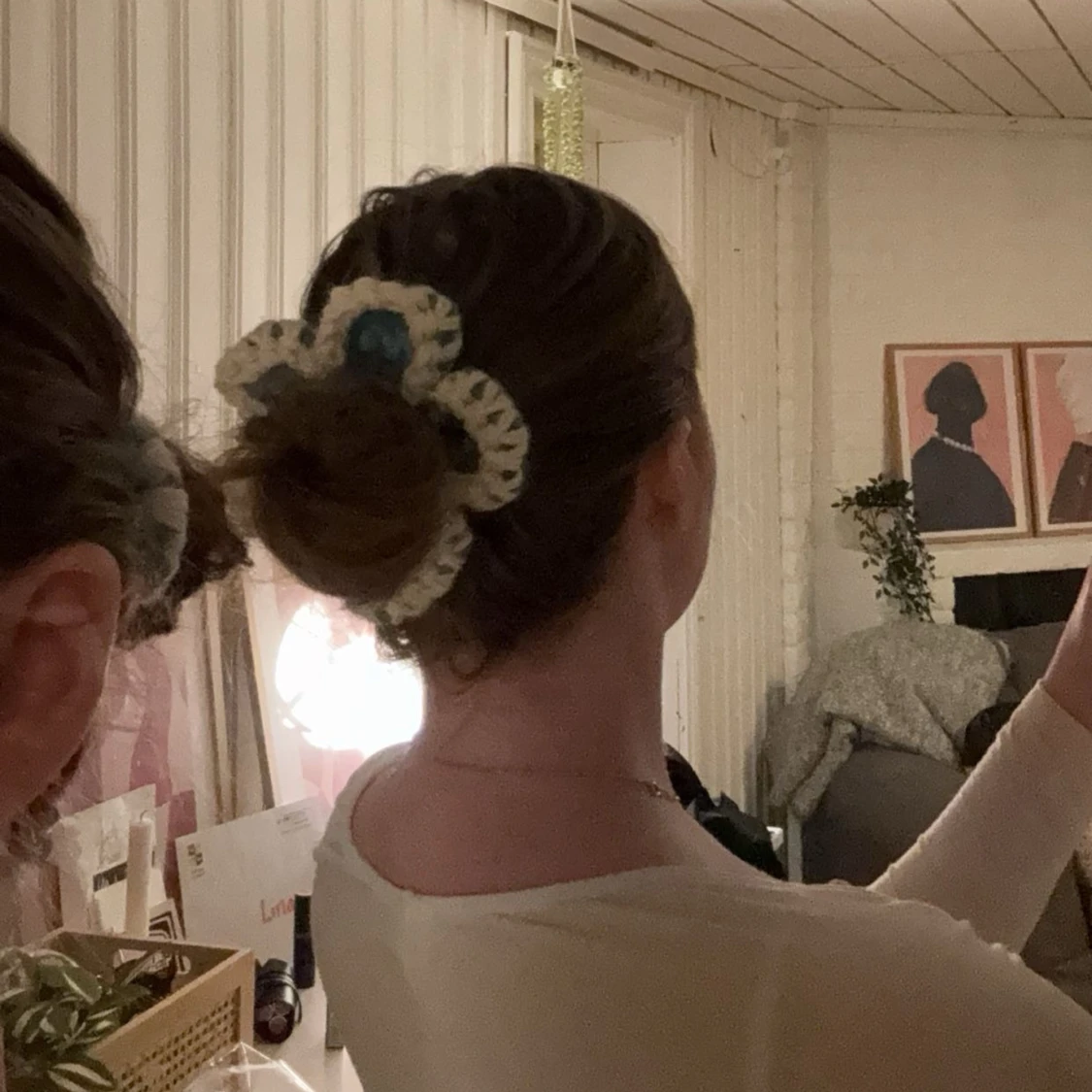 säljer dessa blomscrunchies som jag virkar själv!🌸 finns både färdiga som dom på andra bilden och så har jag garn i dom flesta färgerna så hojta till så virkar jag en precis så som du vill ha den🫶