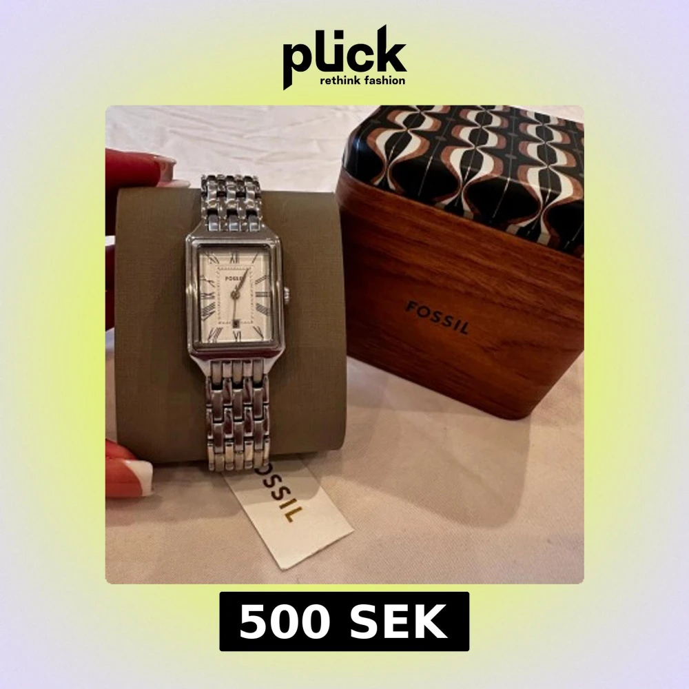 Stilren klocka från Fossil med rektangulärt ur och romerska siffror på vit urtavla. Länkat armband i blankt silverfärgat metall. Kommer i original ask med snyggt mönster. Perfekt accessoar för dig som gillar klassisk och tidlös design.
