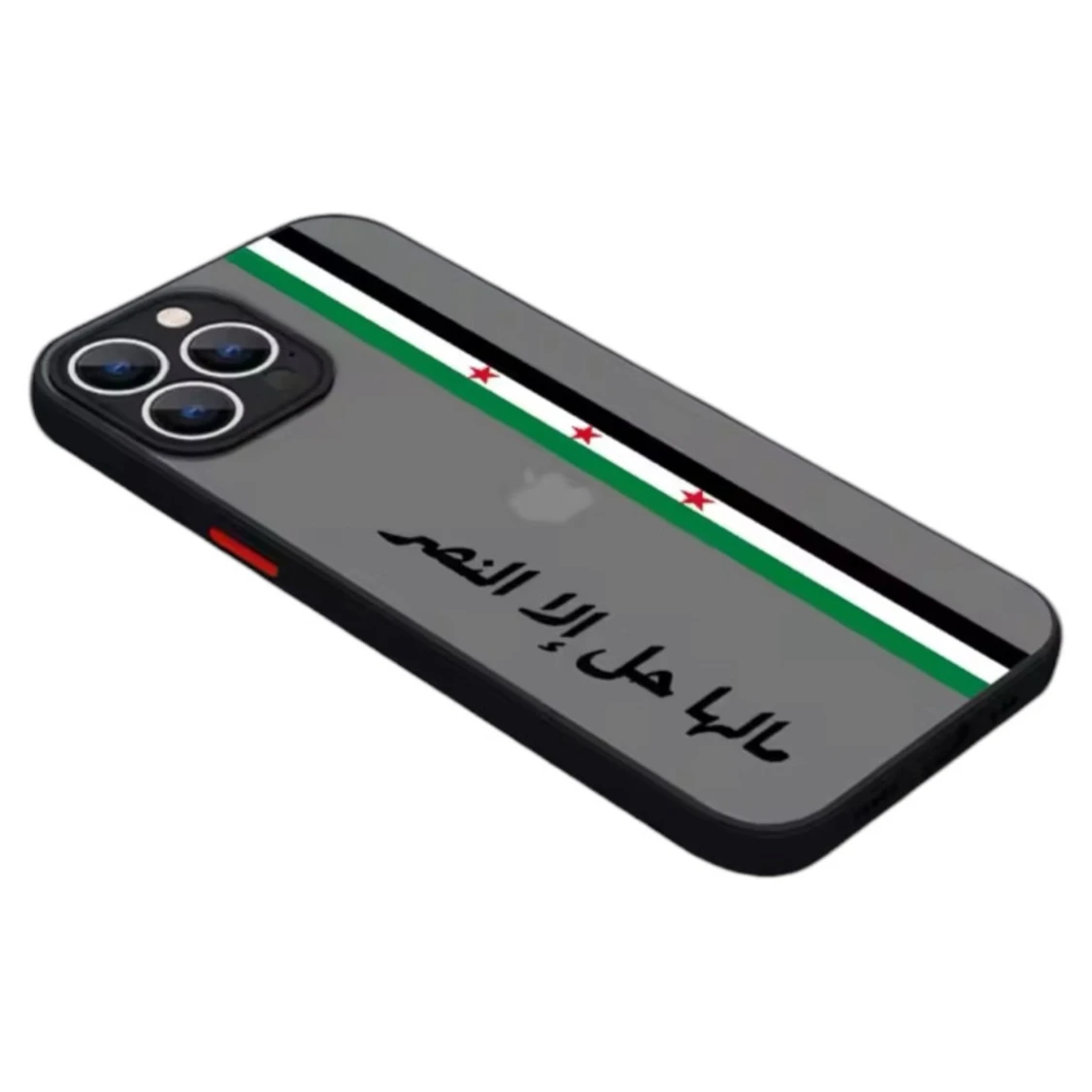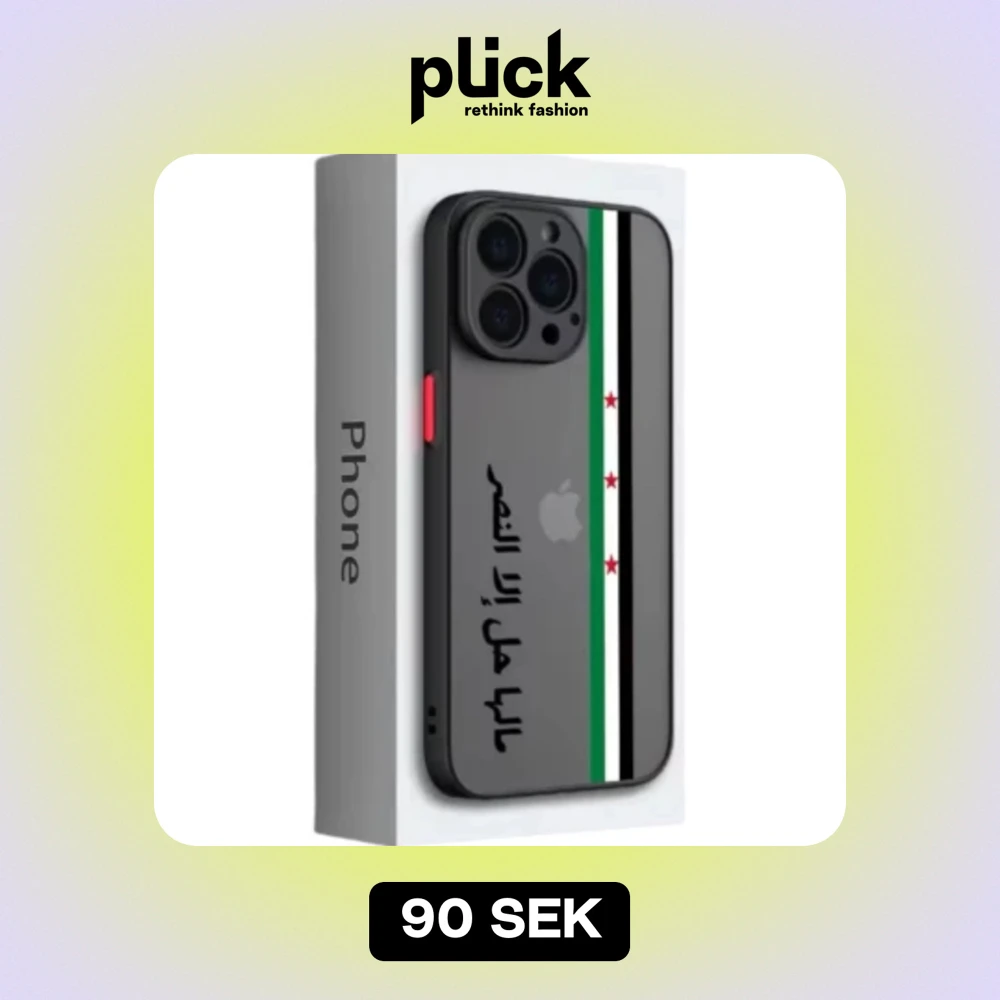 En mobilskal med Free Syria flaggan och texten ”مالها إلا النصر" som översätter till ”inget kvar förutom vinsten”. Mobilskalan är genomskinlig och finns tillgänglig för följande iPhones. iPhone 15, 14 13, 12, 11, 11 PRO max