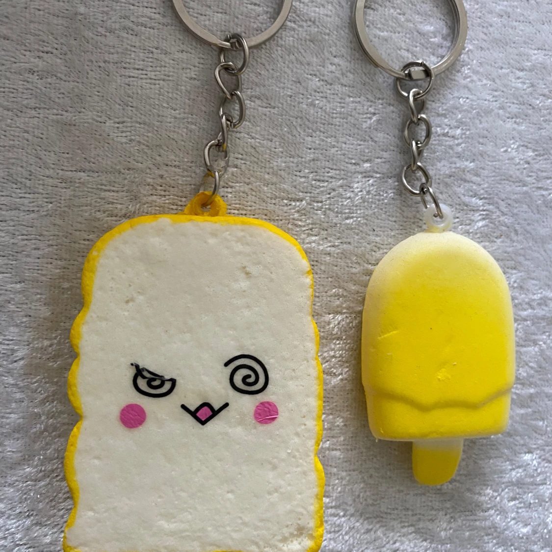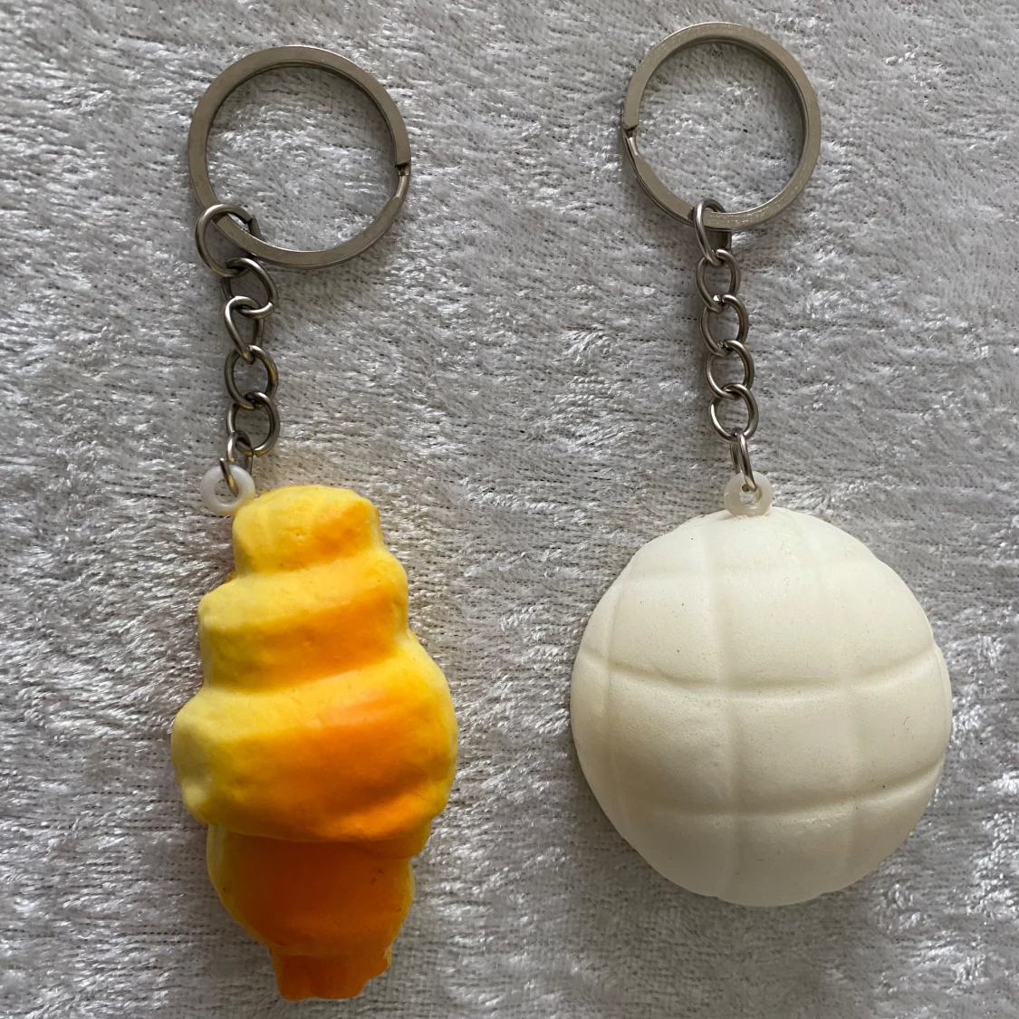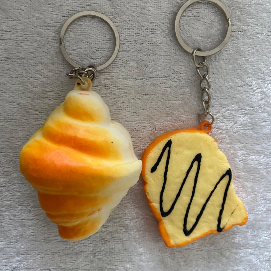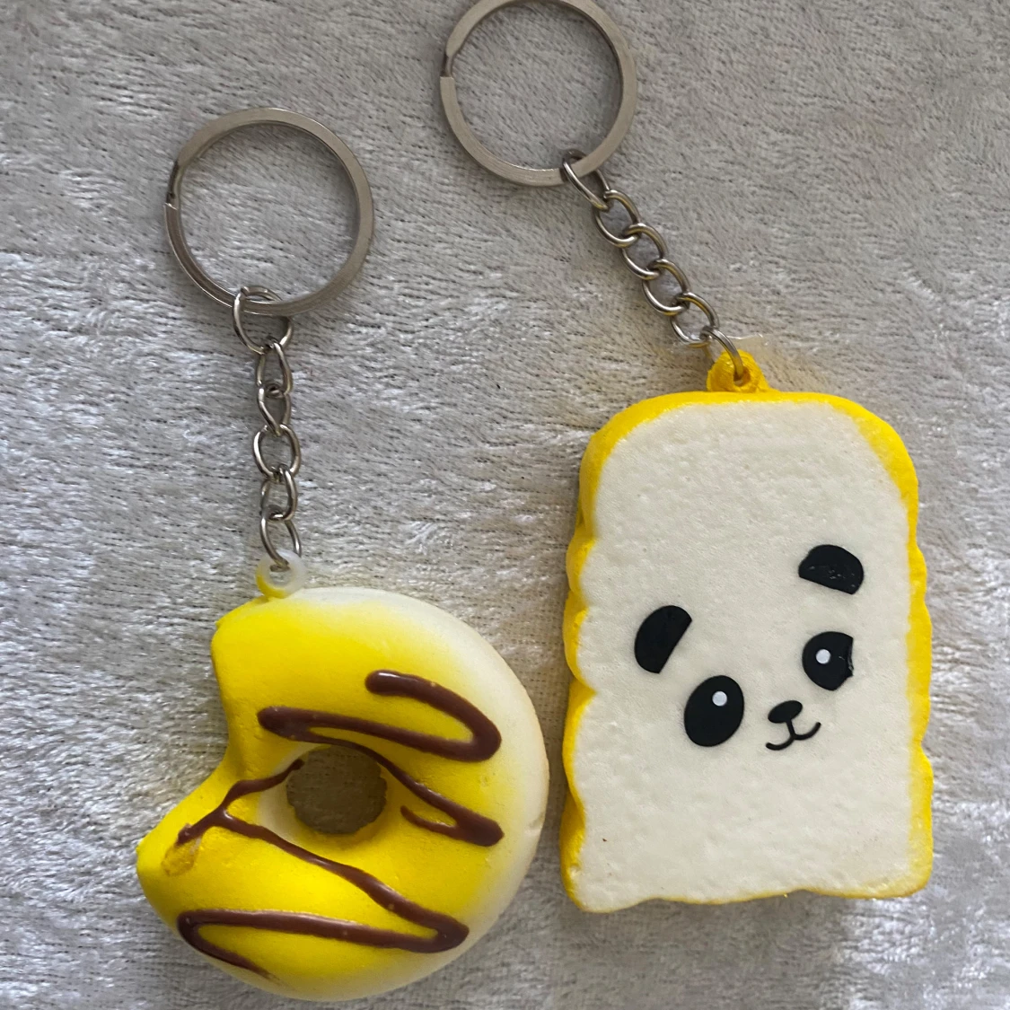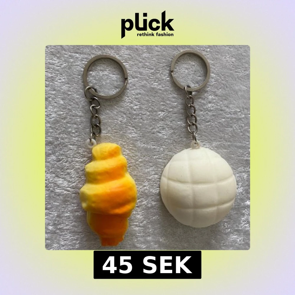 Säljer ett set med roliga och färgglada nyckelringar i form av olika bakverk. Setet inkluderar en croissant, en rund bulle, en donut, en brödskiva med ansikte, en glass och en rosa snurra. Perfekt för att piffa upp dina nycklar eller väskor! 45kr/2st/bild , helt ny