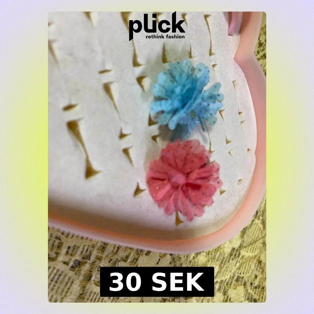 Fyra ringar med stora blommor i tyg, i färgerna blå, rosa, ljusrosa, vinröd och cremevit. Blommorna är fluffiga och vissa har små prickar. Perfekt för dig som vill sticka ut med färgglada accessoarer. Justerbar metallring. 3år + 30kr/2st/bild