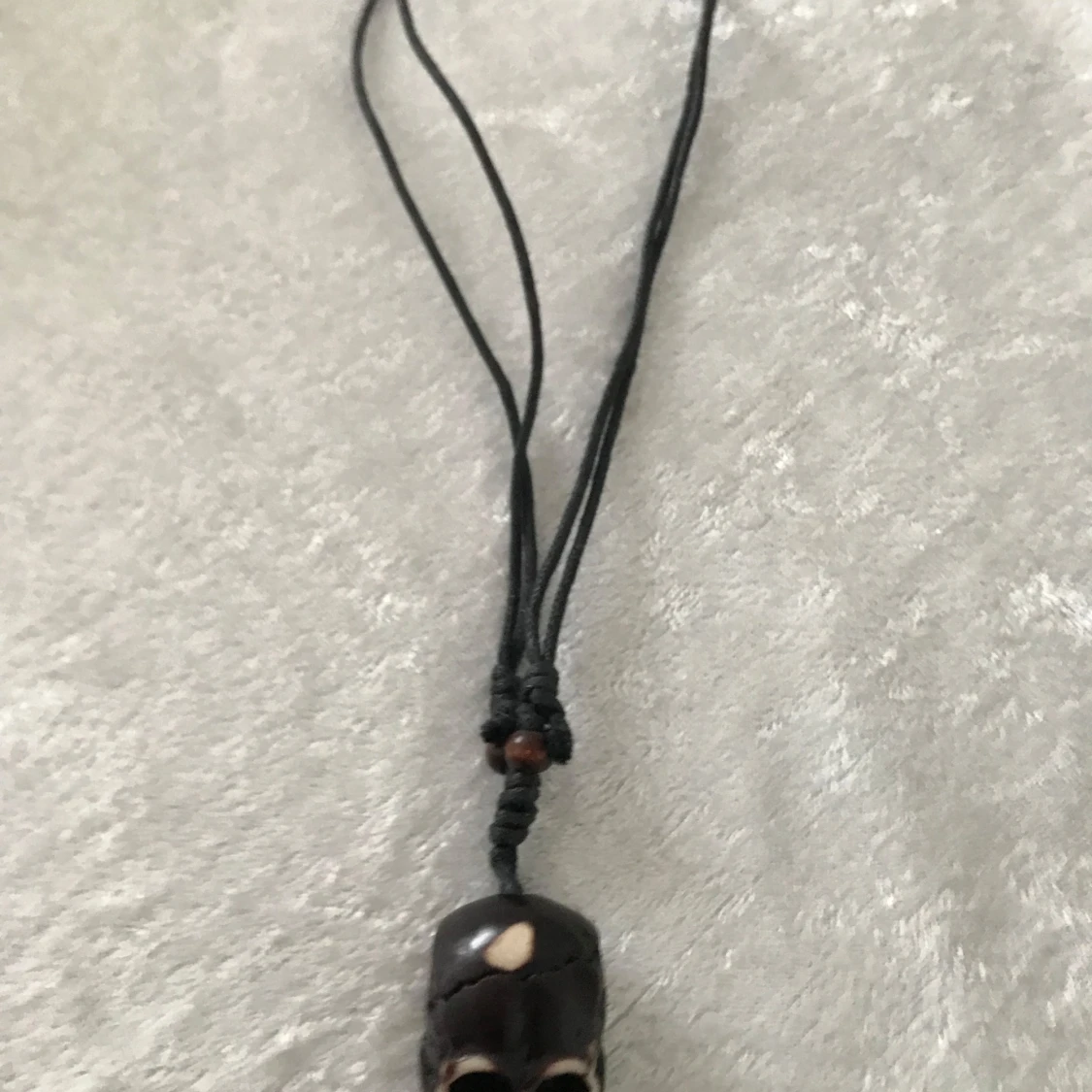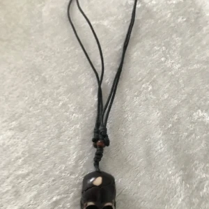 Unikt halsband med ett mörkt dödskallehänge. Hänget har vita detaljer och hänger på en svart snodd. Perfekt för att ge en edgy touch till din stil. Helt ny, finns fler kvar