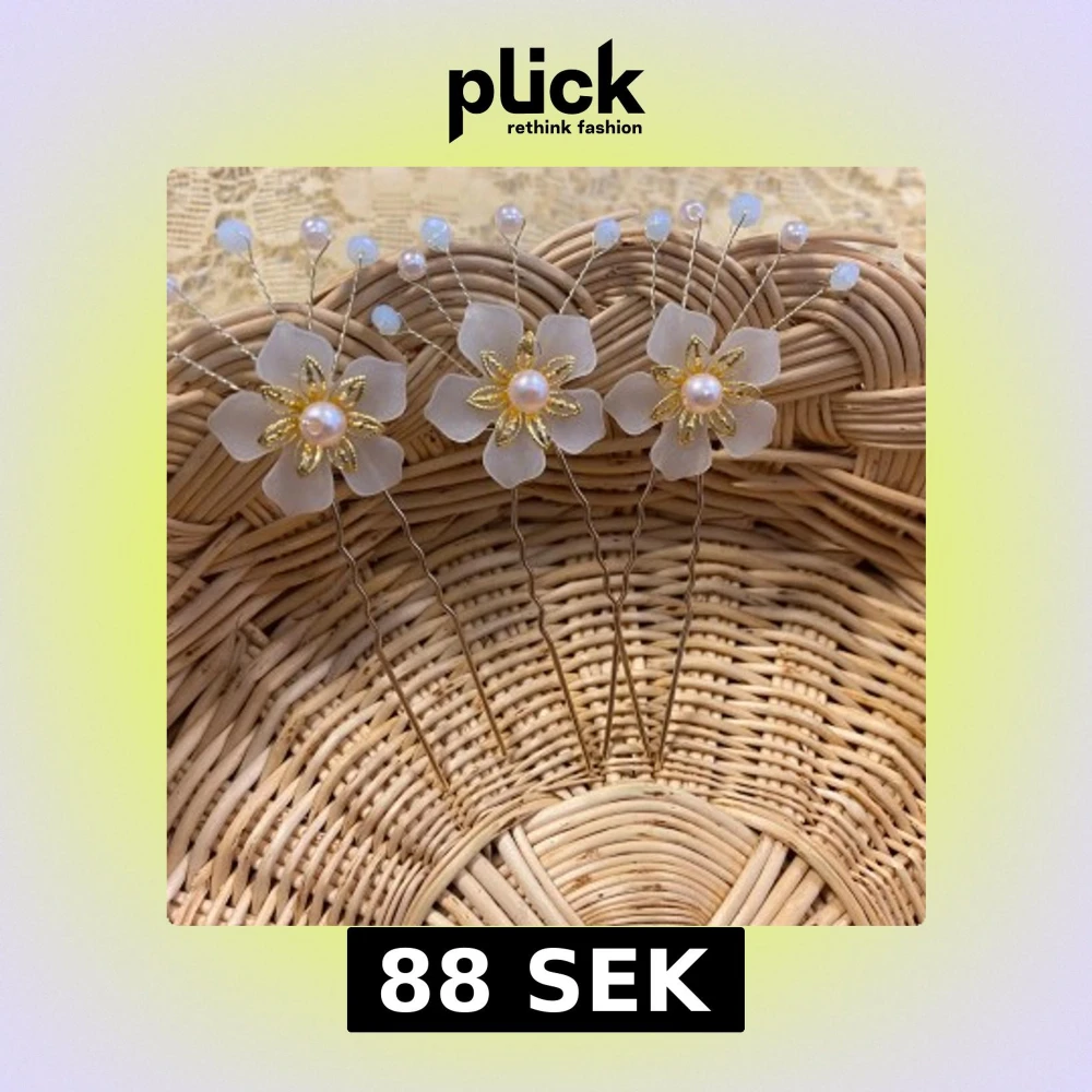 Tre hårnålar med vita blommor i frostat material, dekorerade med guldfärgade detaljer och pärlor i mitten. Små pärlor och ljusblå kulor sitter på tunna silverfärgade trådar som sticker ut från varje blomma. Perfekt för att ge en söt och elegant touch till frisyren. Finns fler kvar, samma frakt