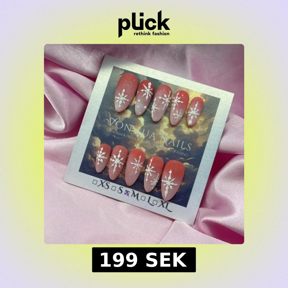 Handgjorda press-on naglar i en medium mandelform med en snygg ombre-effekt i rosa och nude, dekorerade med vita snöflingor. Perfekt för dig som vill ha en unik och kreativ nageldesign. Finns i storlek M: 16 mm, 12 mm, 12,5 mm, 11,5 mm, 10 mm