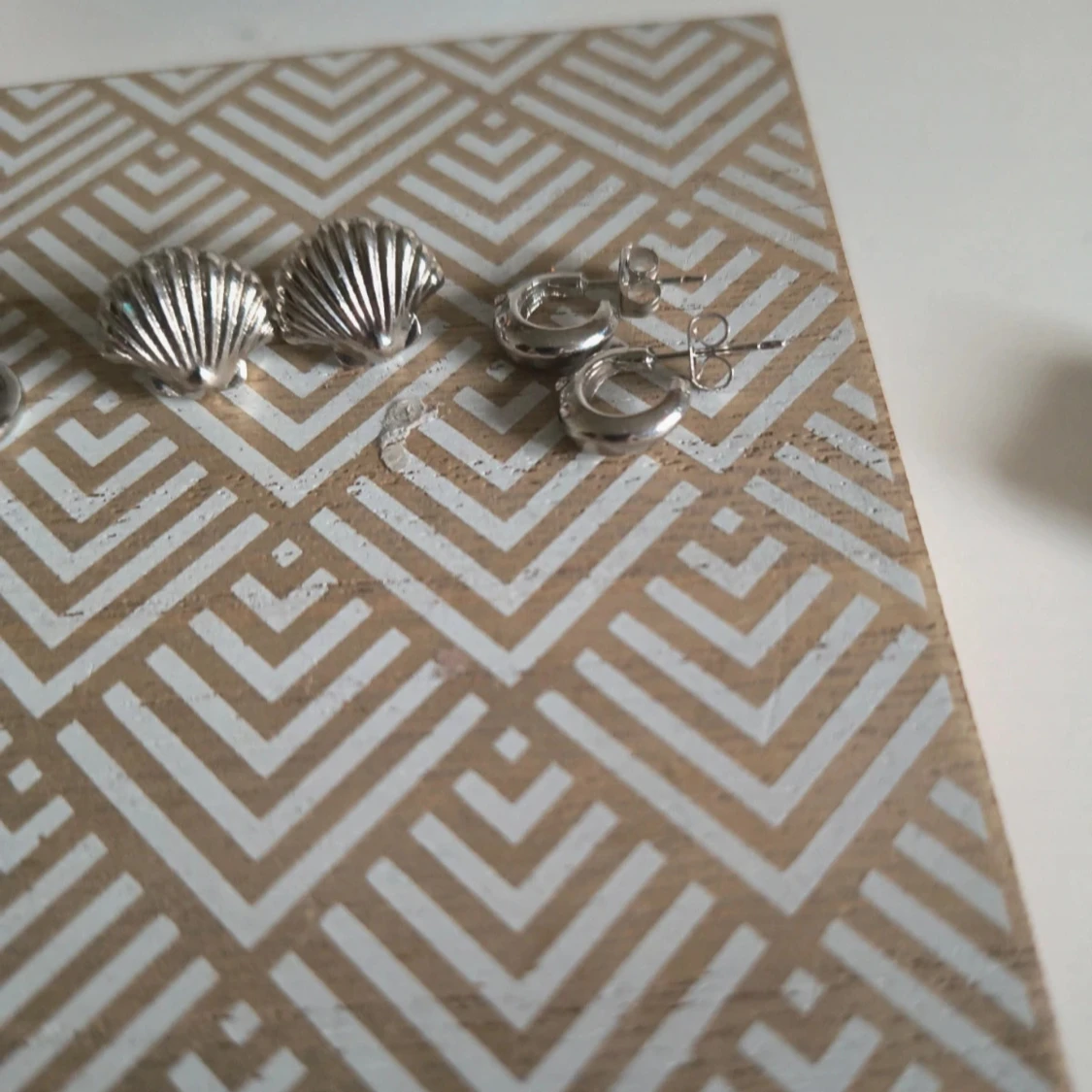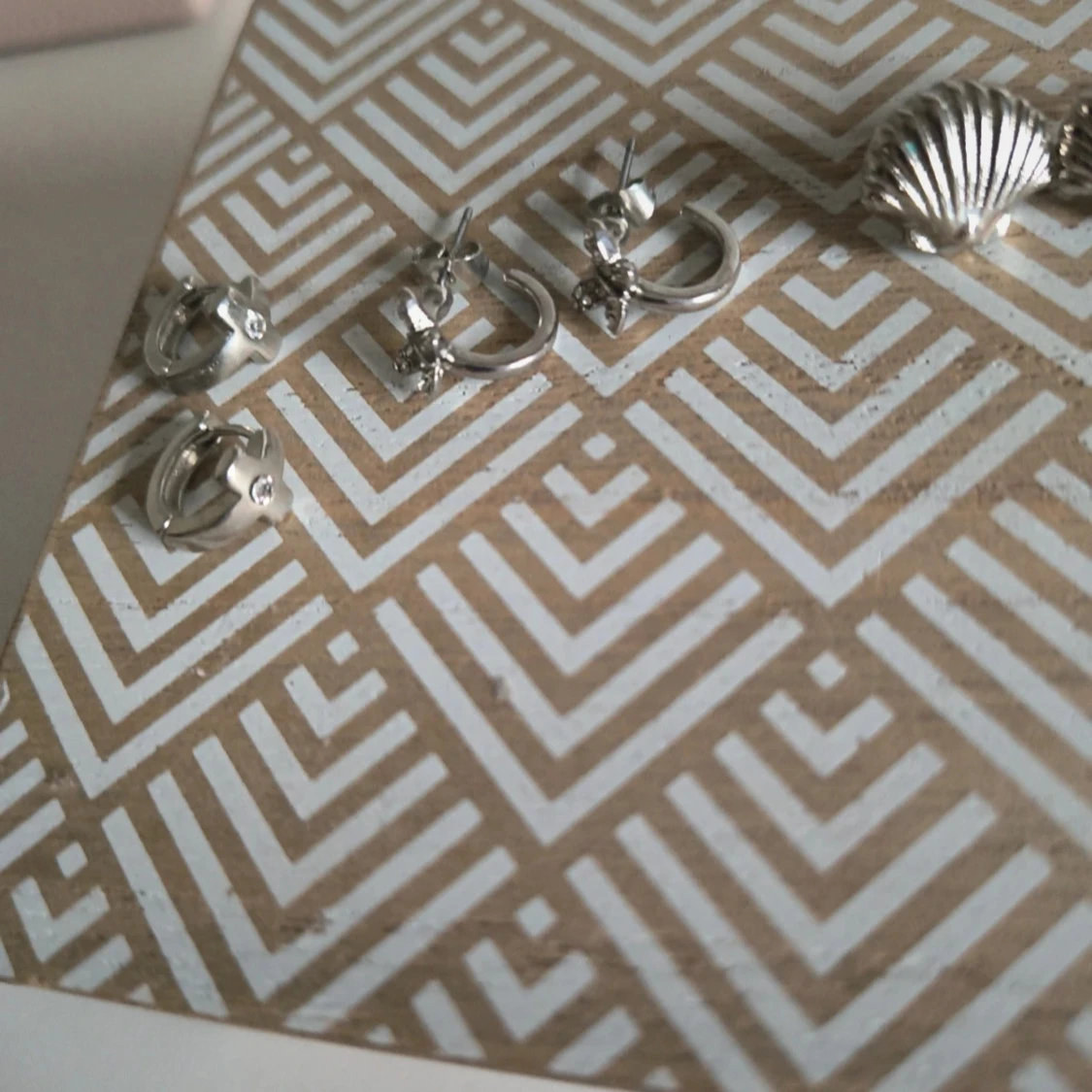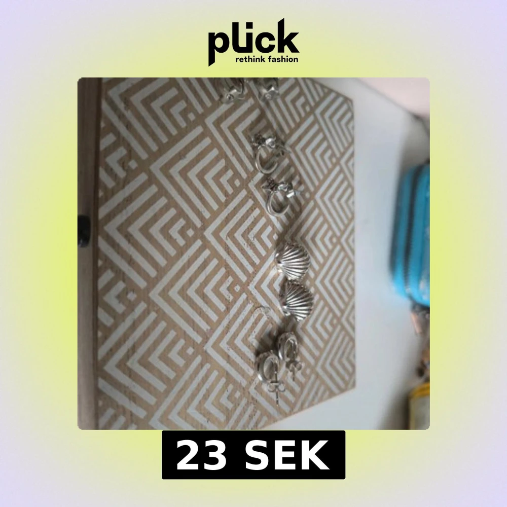 Fyra par örhängen i silverfärg, ett par kors hoops, sen ett par med fjärilar på sig. Ett par med stenar i sig och ett par snäckformade örhängen. Alla är i metall och har en modern och stilren look, perfekta för att mixa och matcha till olika outfits. Inte nickel fria.