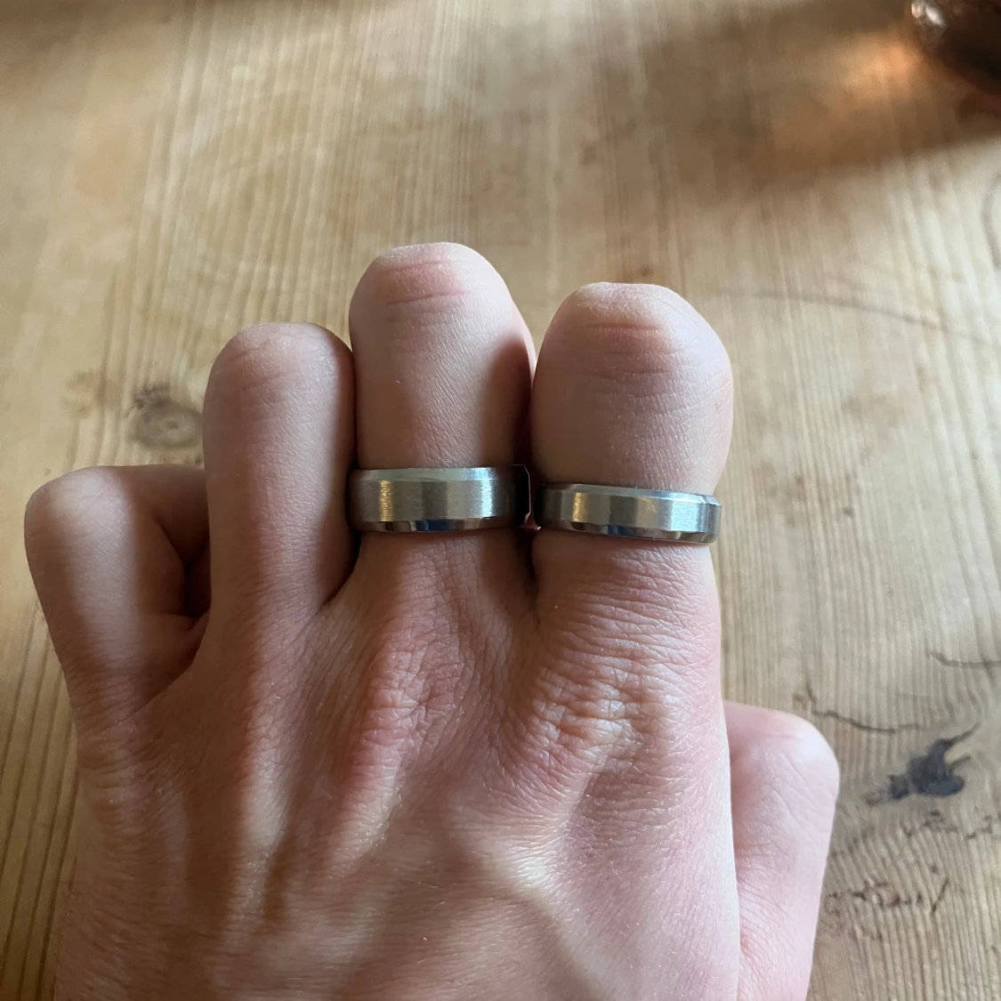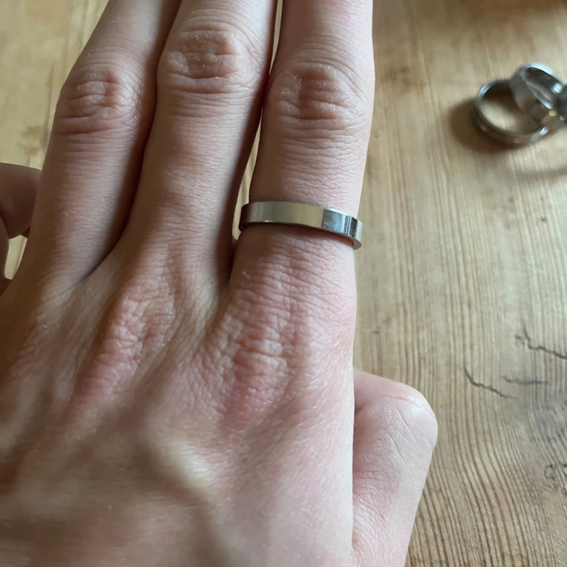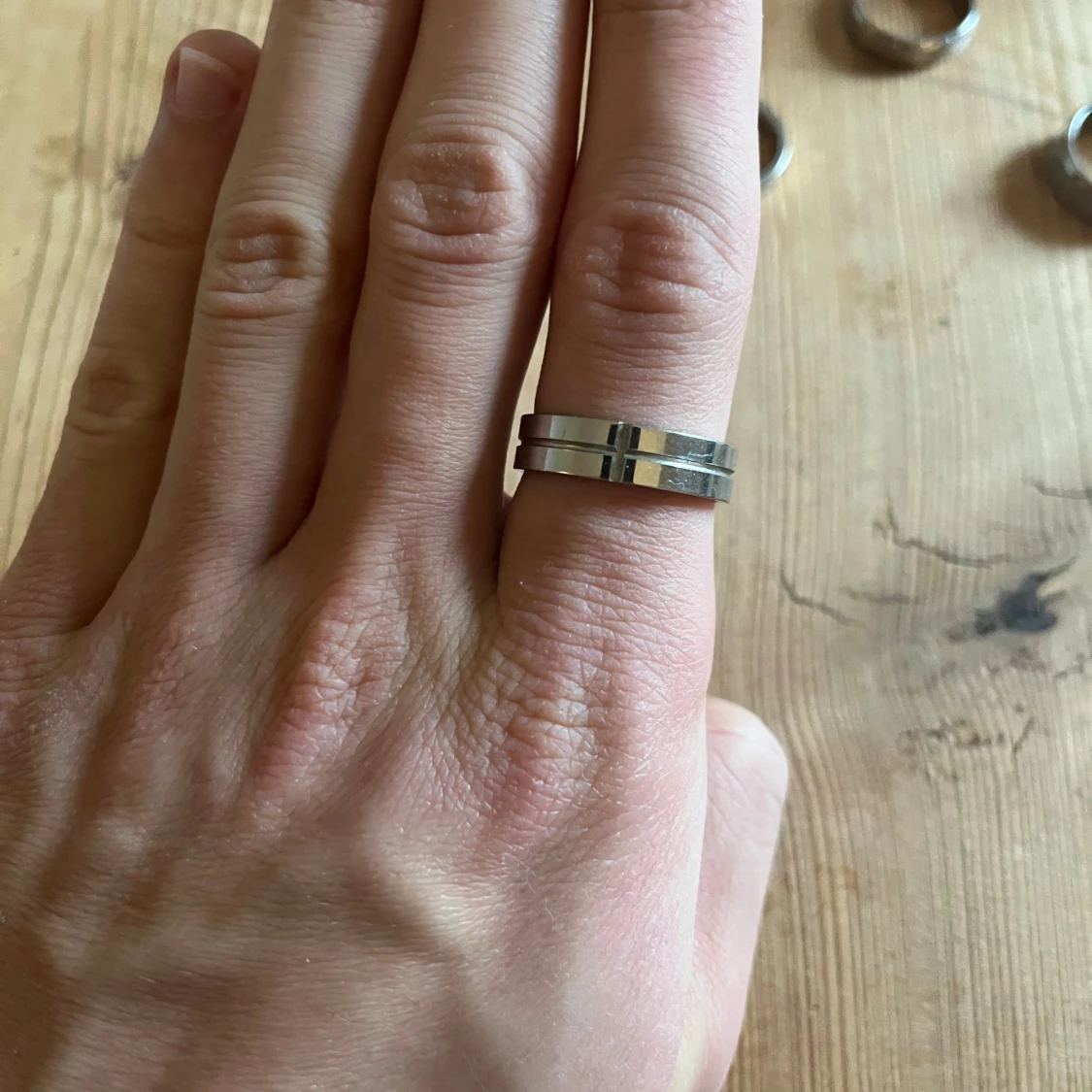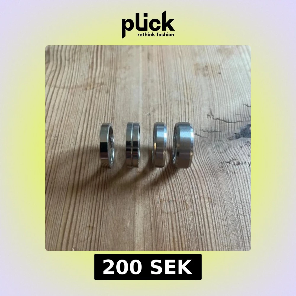 Säljer ett set med fyra coola silverfärgade ringar i metall. Två av ringarna har en matt finish och de andra två är blanka, varav en har ett snyggt korsmönster. Perfekt för dig som gillar minimalistisk och modern stil. Passar både som statement eller att kombinera flera på samma hand.