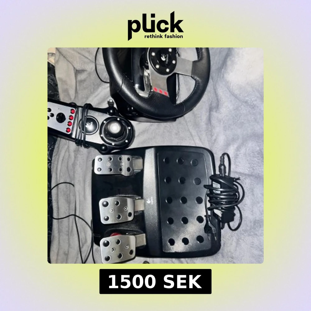 Säljer ett Logitech G27 racingset med ratt i svart läder och metall, tre pedaler i metall och svart plast samt separat växelspak med röda knappar. Perfekt för bilspel och racing på dator eller konsol.