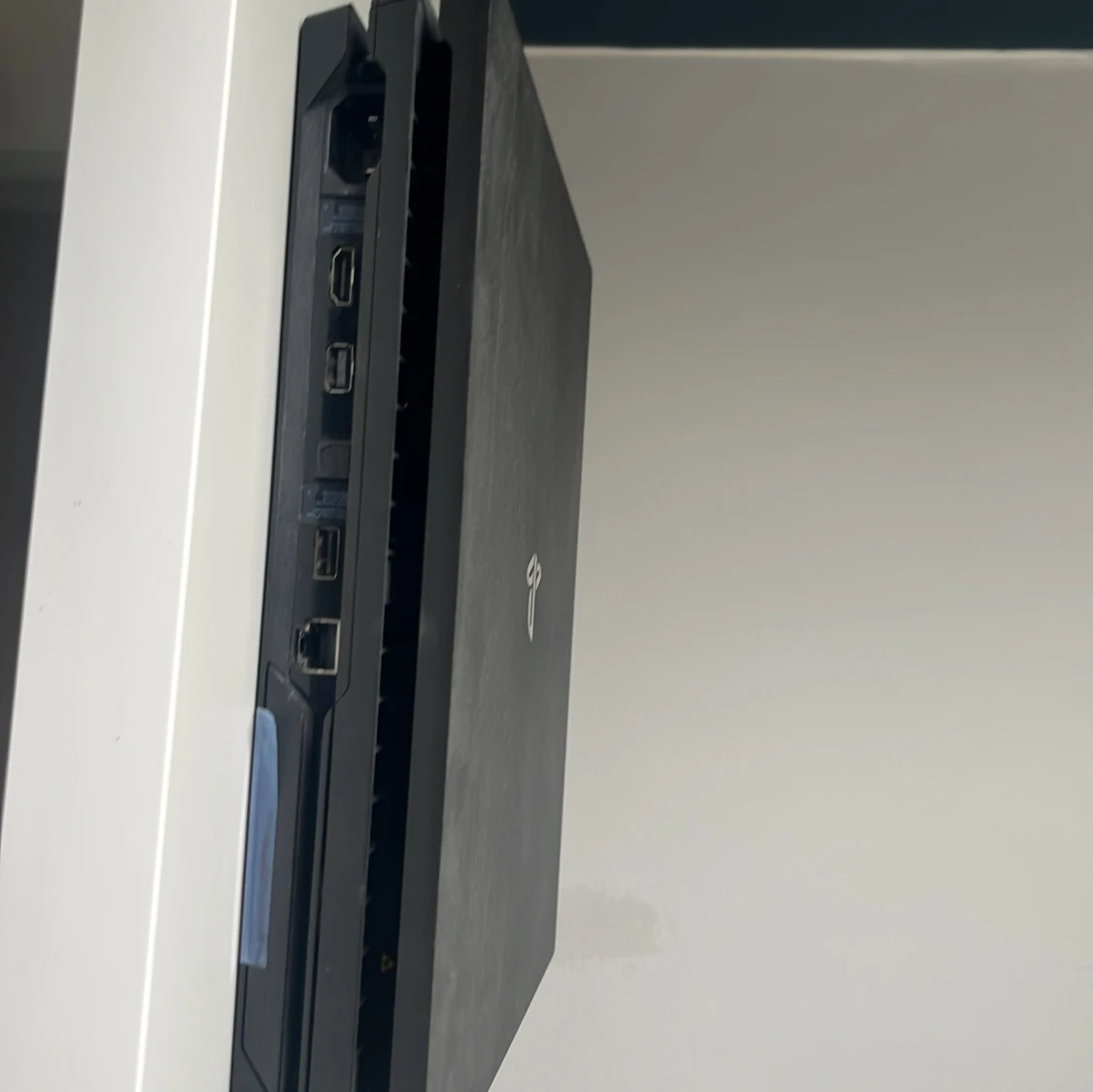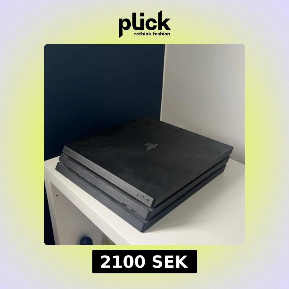 Bilderna visar en PlayStation 4 Pro-spelkonsol från Sony., endast en svart spelkonsol med PlayStation-loggan. Perfekt för gaming, kommer med en silverfärgad handkontroll och kablar. Skriv till mig privat om du vill se hur handkontrollen ser ut.
