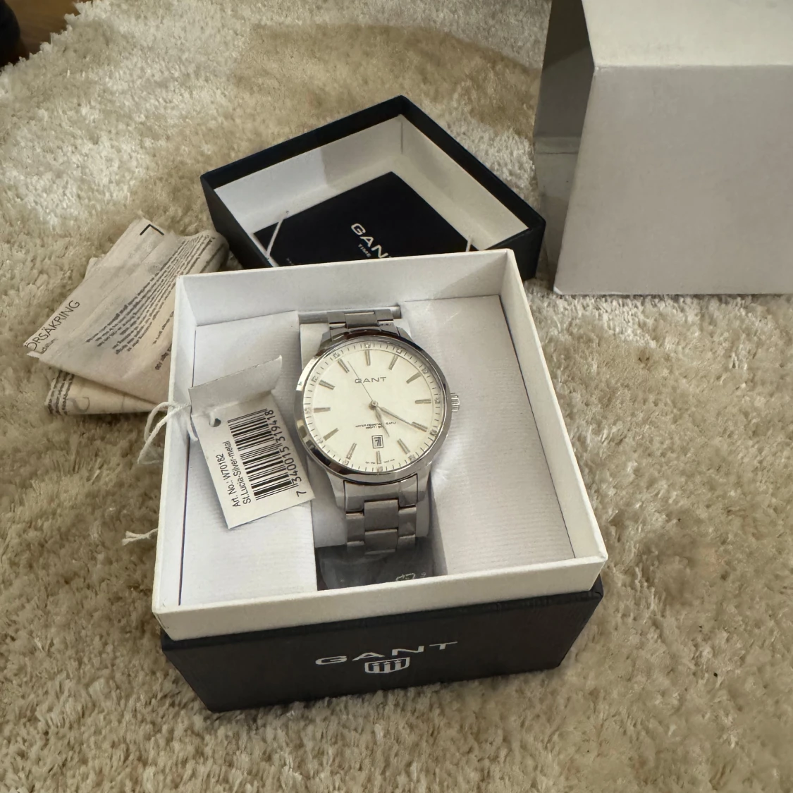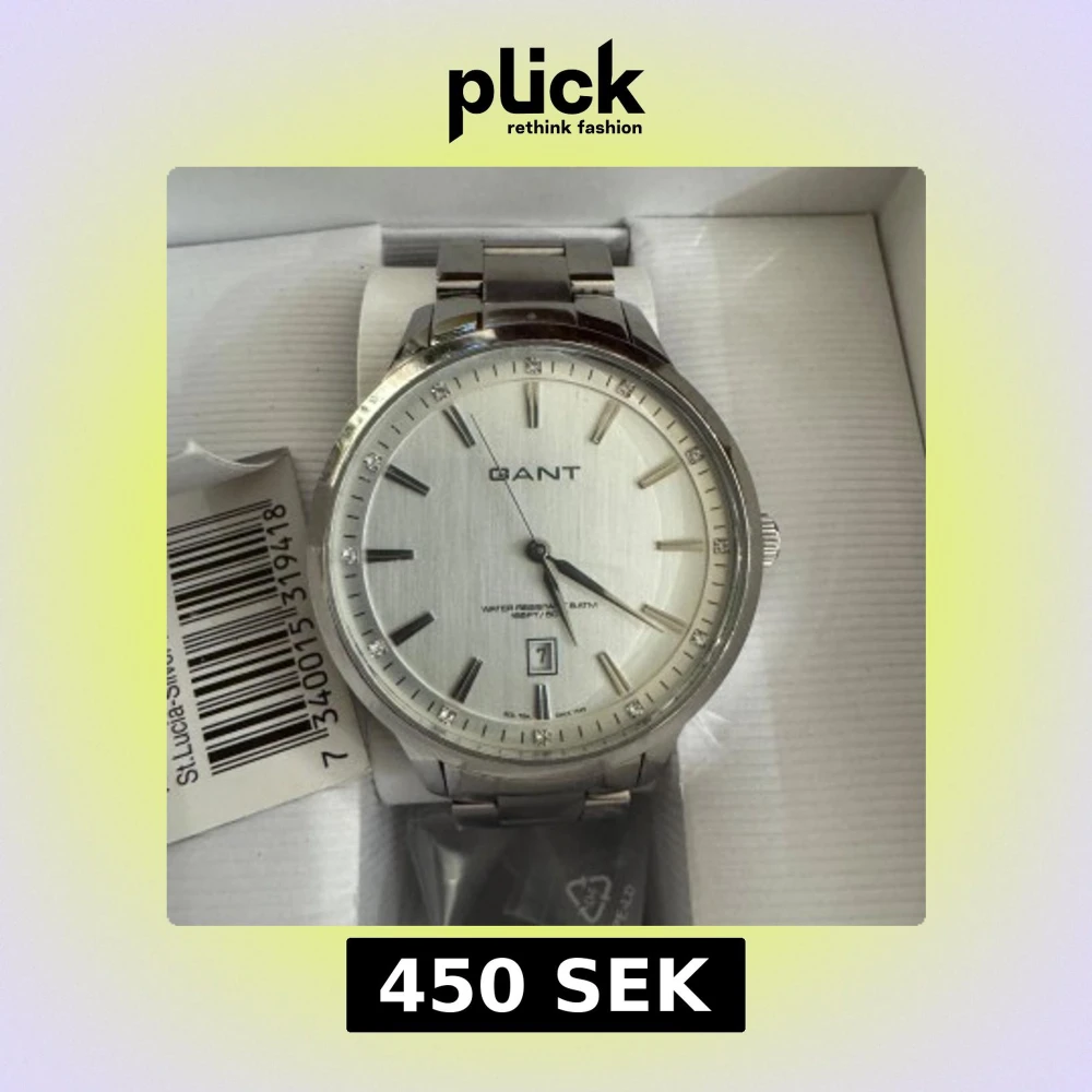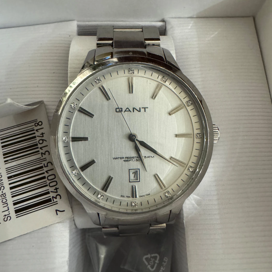 Stilren klocka från GANT i silverfärgat rostfritt stål med rund urtavla och datumvisning. Urtavlan är ljus med silverfärgade index och visare. Klockan har en klassisk länkarmband och minimalistisk design.