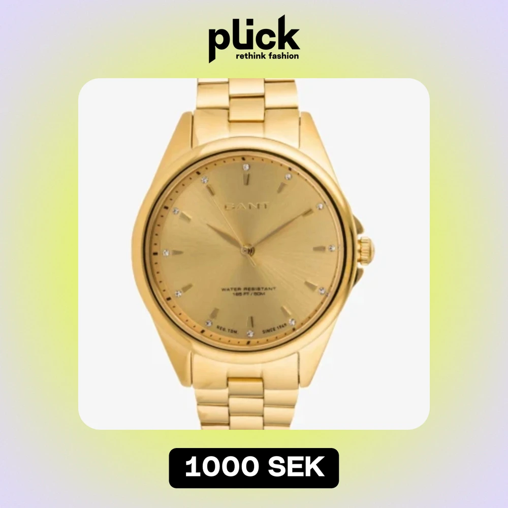 Säljer en snygg guld klocka från GANT. Klockan är vattenresistent upp till 165 ft/50m och har en elegant design med guldarmband och urtavla. Perfekt för både vardag och fest. Klockan är i nyskick och har en stilren look som passar till alla tillfällen.