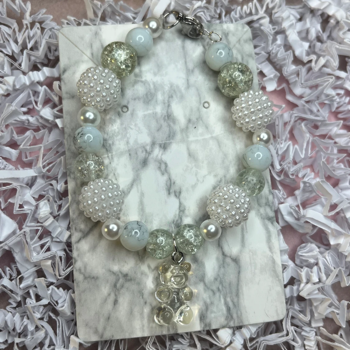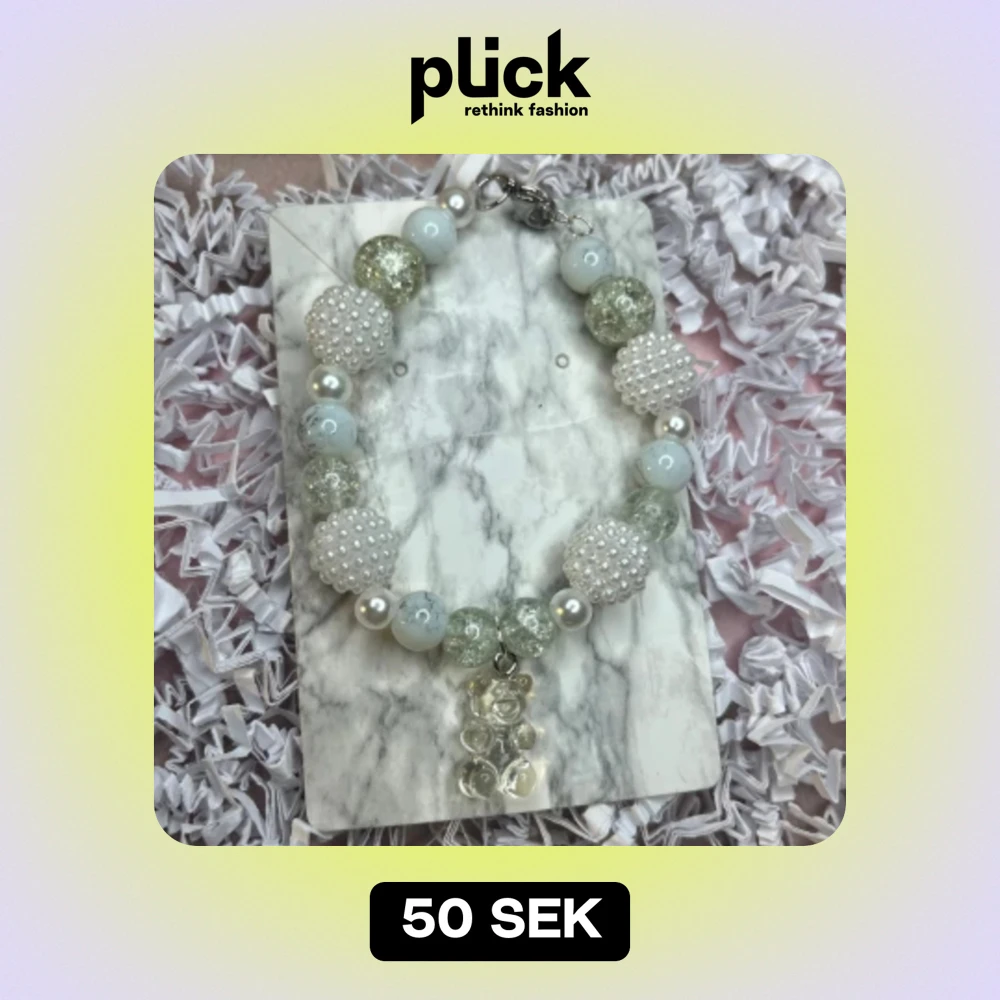Genomskinligt/vit armband med silvrig kedja som går att justera, armbandet har även en berlock,