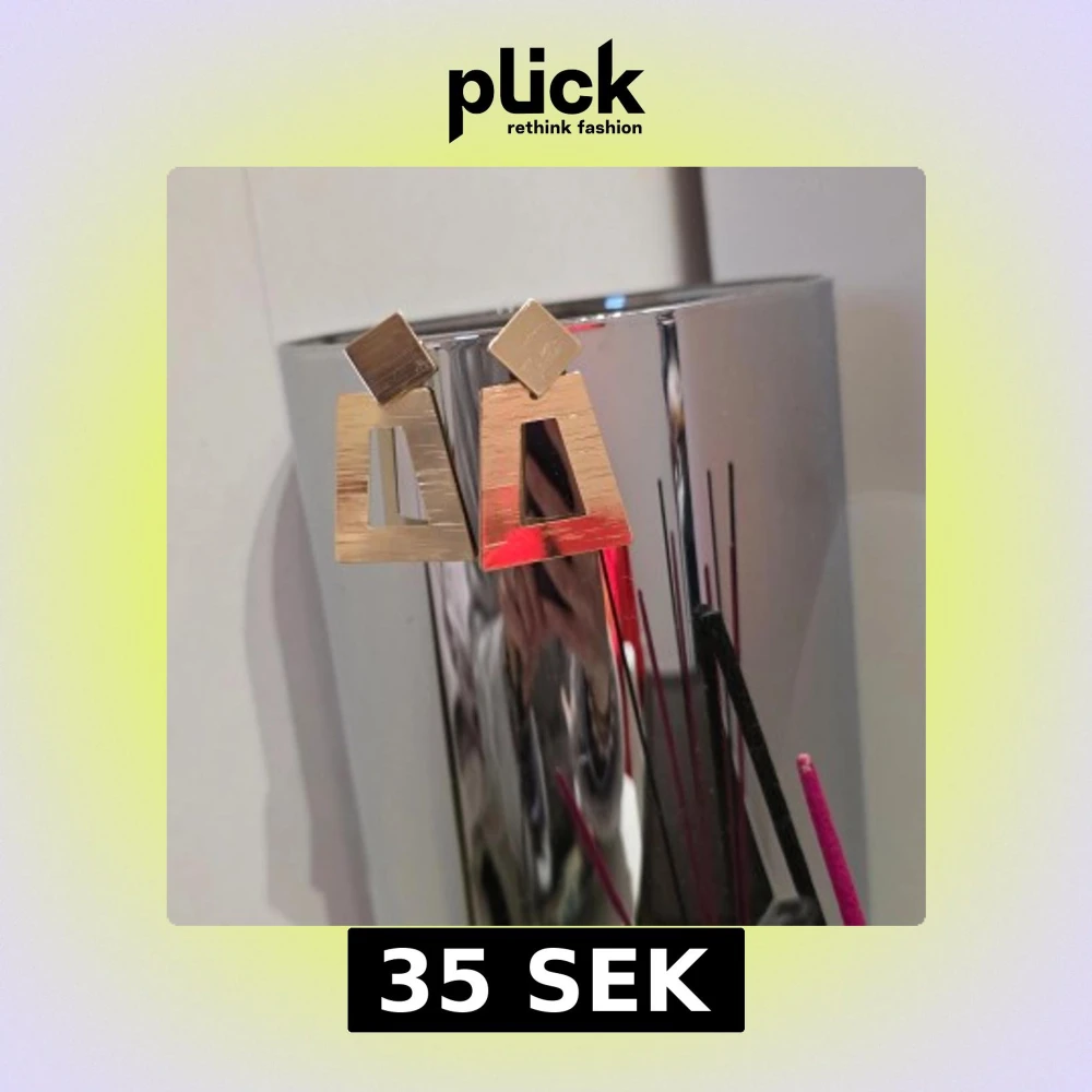 Säljer ett par trendiga örhängen i guld med geometrisk design. Örhängena har en fyrkant upptill och en större, rektangulär form med utskärning nedtill. Perfekta för dig som gillar stilrena och moderna accessoarer.