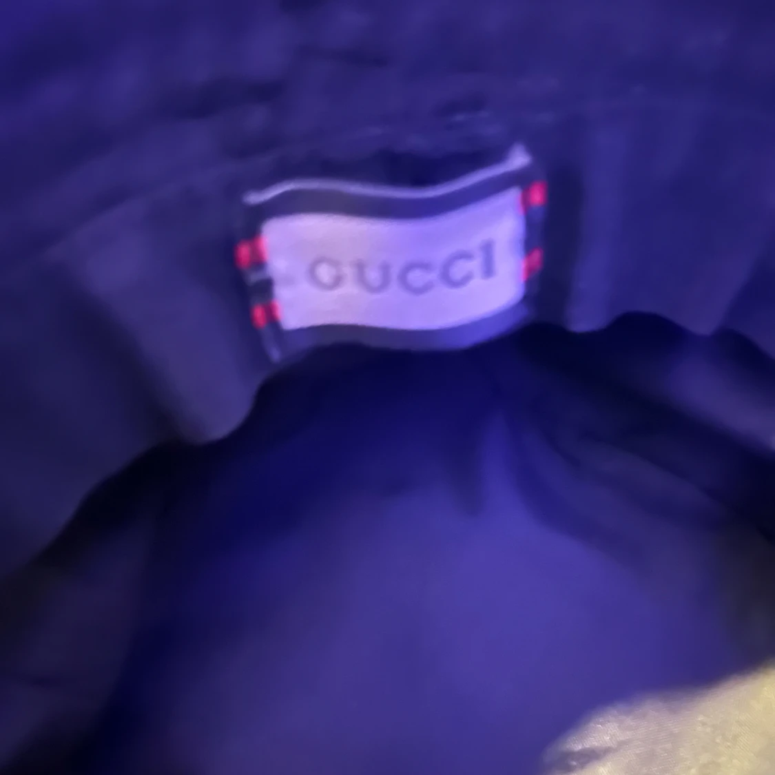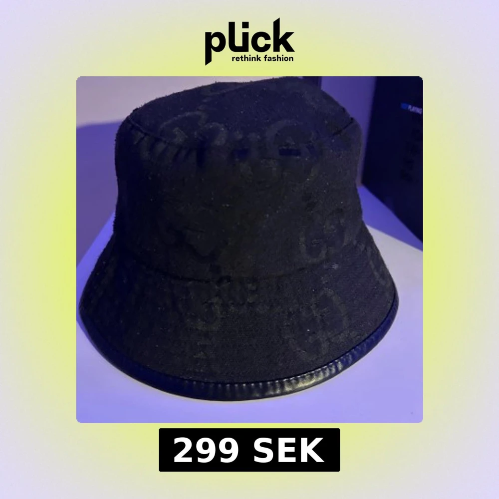 Säljer en svart jumbo bucket hat från GG med diskret GG-monogram över hela hatten. Hatten har en klassisk form med rund kulle och nedåtlutande brätte, samt en snygg kant i svart skinnimitation. Perfekt accessoar för en trendig streetstyle-look.
