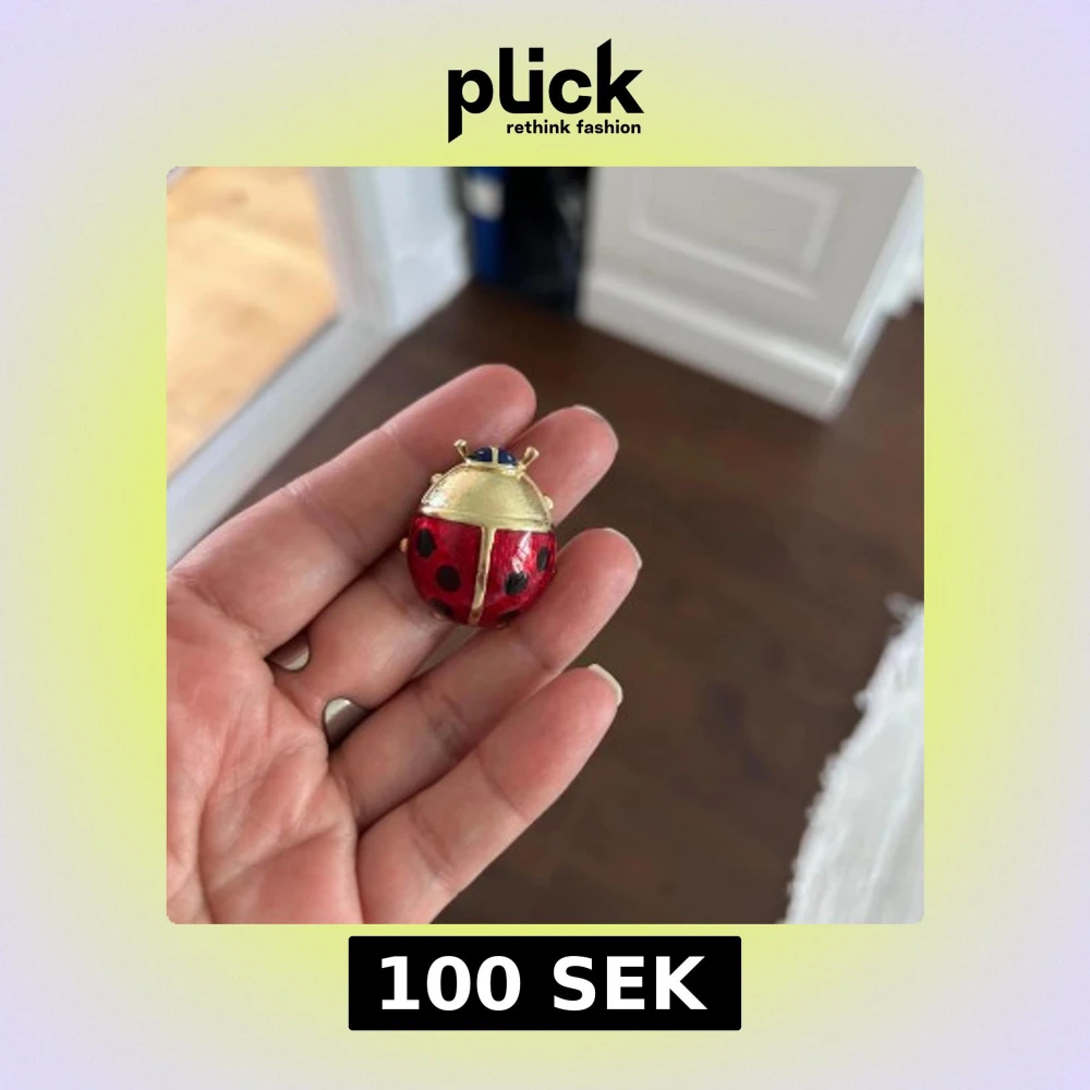 Säljer en superfin brosch formad som en nyckelpiga med glänsande röd kropp, svarta prickar och guldfärgade detaljer. Huvudet har blå inslag och broschen är riktigt iögonfallande och söt. Perfekt accessoar för att liva upp din outfit.