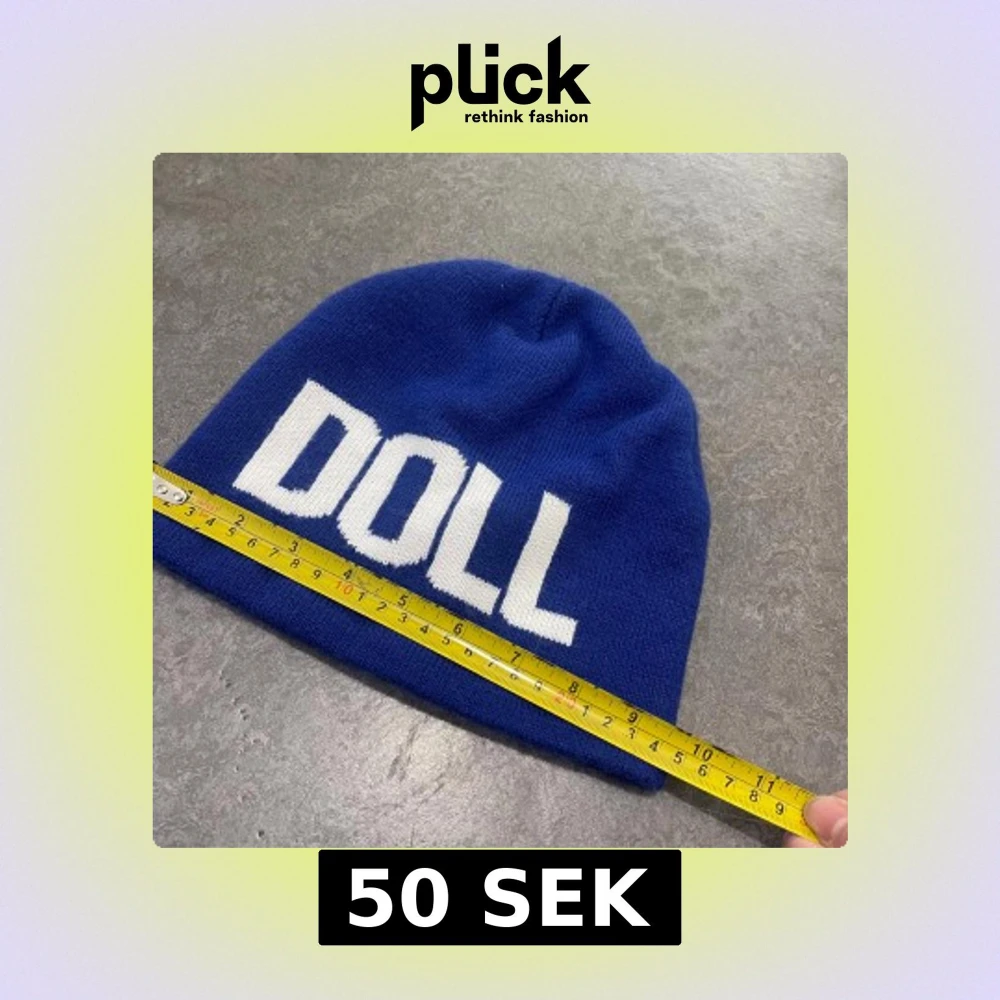 Blå mössa från Gina Tricot med stor vit text 'DOLL' framtill. Klassisk form och tillverkad i mjuk, stretchig akryl. Perfekt accessoar för att sticka ut och hålla värmen under kyliga dagar.