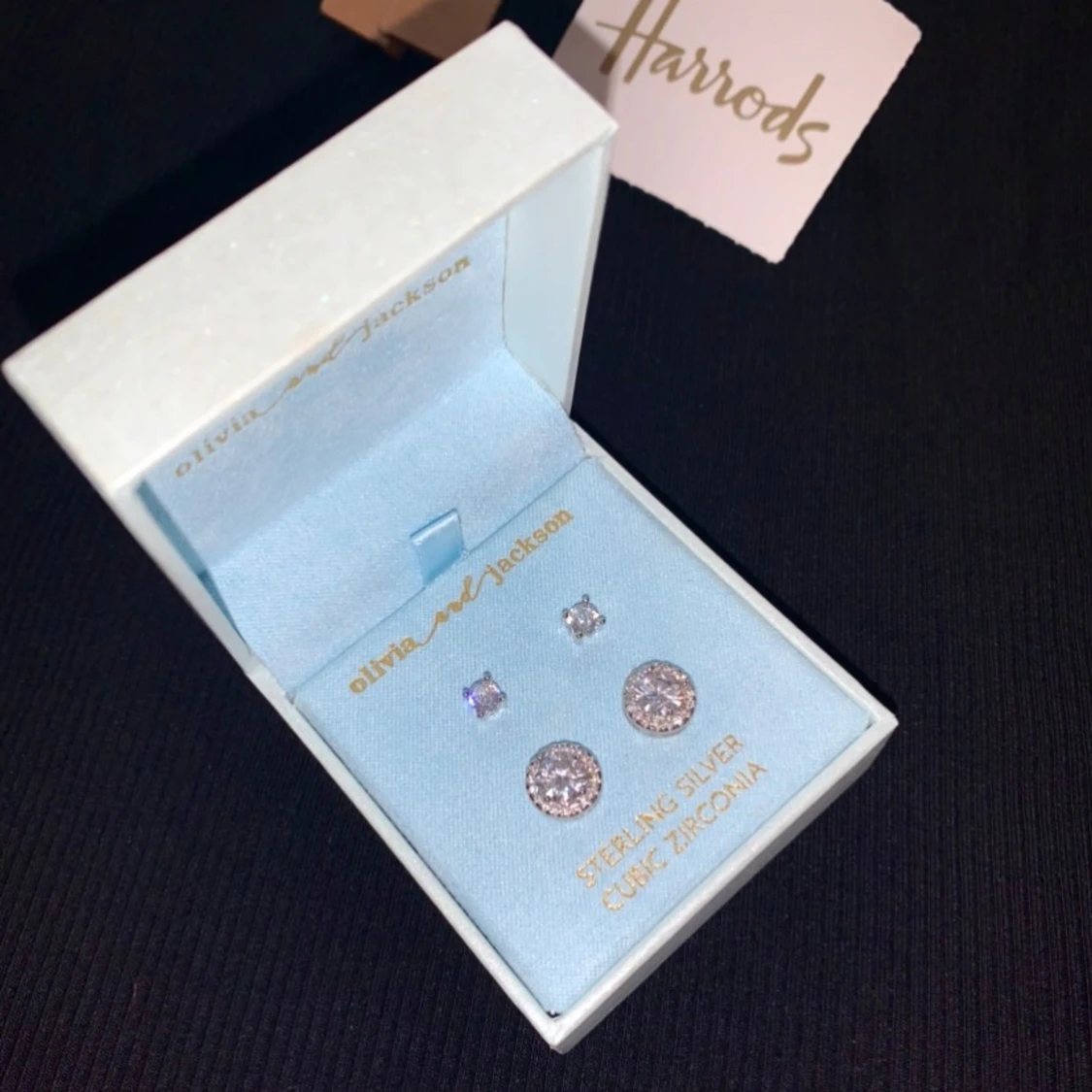 Två par Olivia and Jackson studs örhängen i fin ljusblå giftbox. Sterling Silver Cubic Zirconia. Nya😊Perfekt som present till dig själv eller någon annan💘