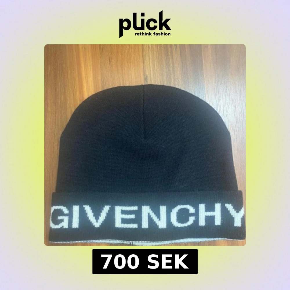Svart mössa från Givenchy med bred uppvikt kant och stor vit Givenchy-logga framtill. Insidan är vit och materialet är stickat, vilket gör den både mjuk och skön. Perfekt för dig som vill ha en clean och lyxig look med tydlig designerstil.