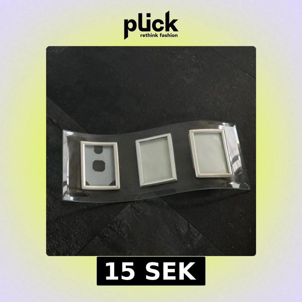 Modern fotoram i böjt glas med tre inbyggda rektangulära ramar i silverfärg. Perfekt för att visa tre foton tillsammans på ett stilrent sätt. Passar snyggt på hyllan eller skrivbordet. En bit av ena ramen har lossnat men det kan enkelt limmas ihop.