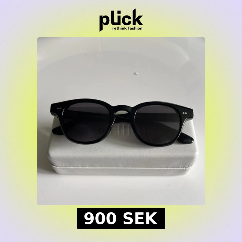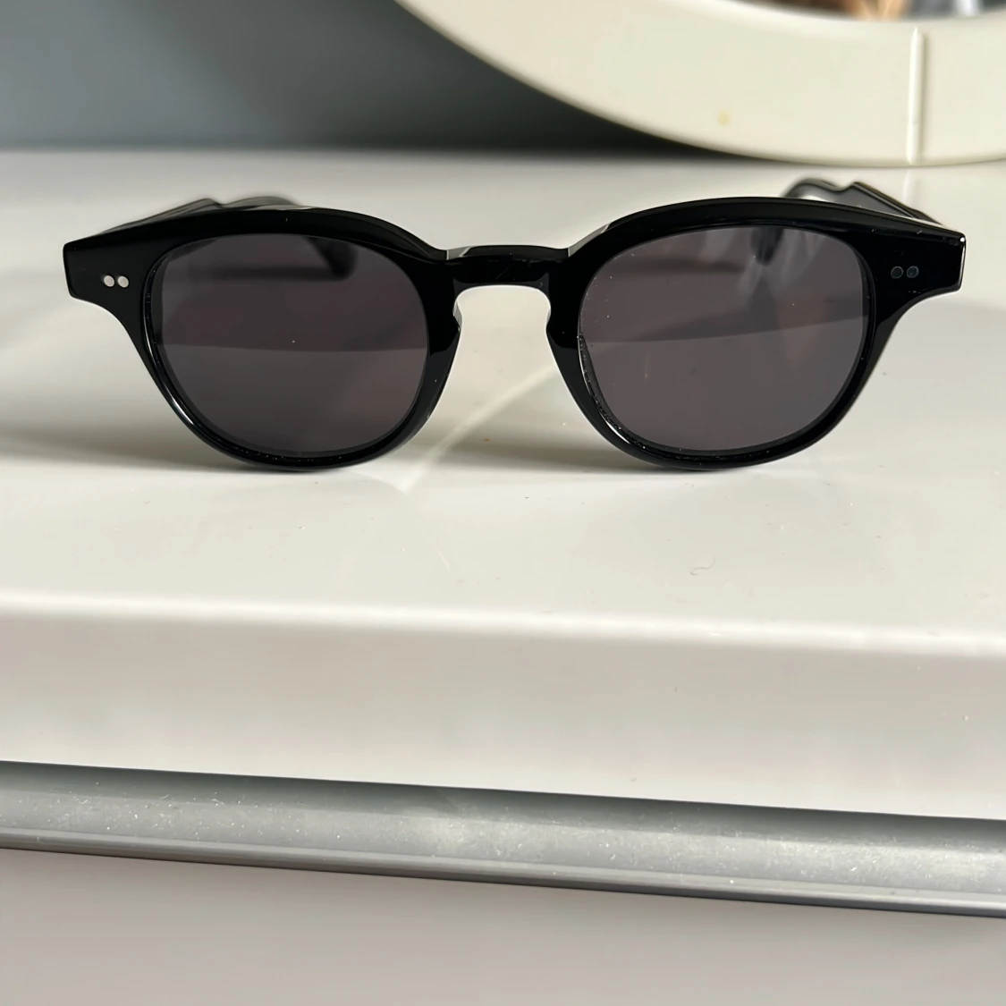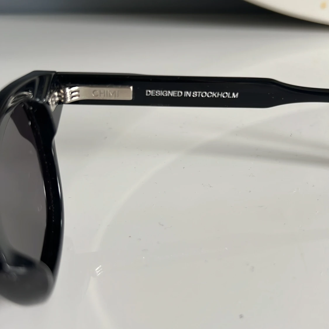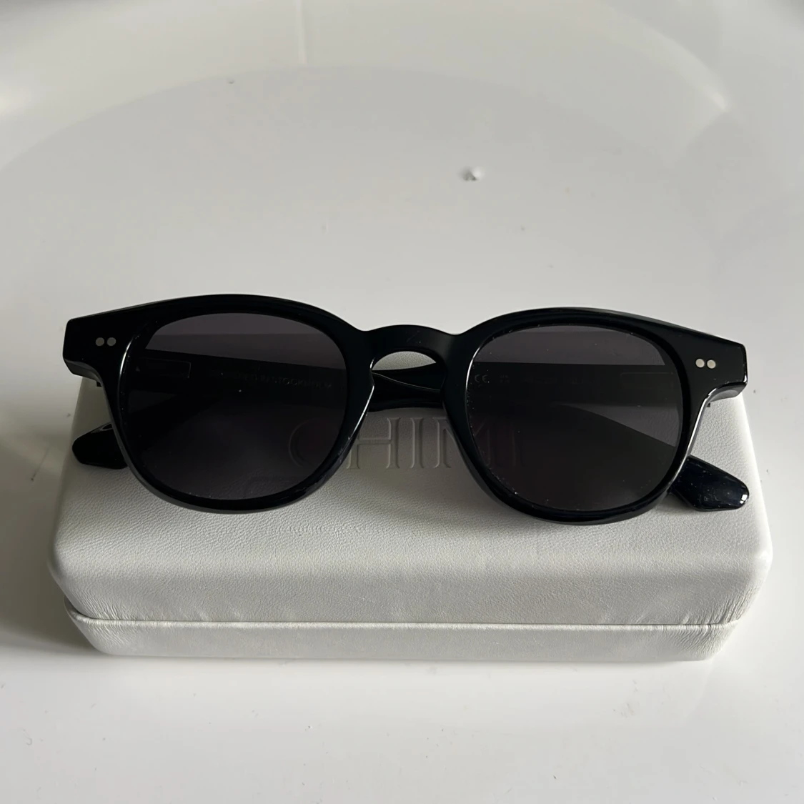 Snygga svarta solglasögon från CHIMI, modell Core 01. De har en klassisk rundad form med tjock båge och mörka glas. Passar perfekt för dig som vill ha en stilren look. De är använda endast ett fåtal gånger så man ser inga tecken på användning.