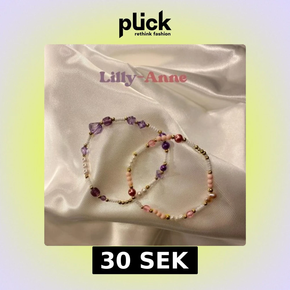 Två handgjorda armband med små pärlor i lila, rosa, vitt och guld.