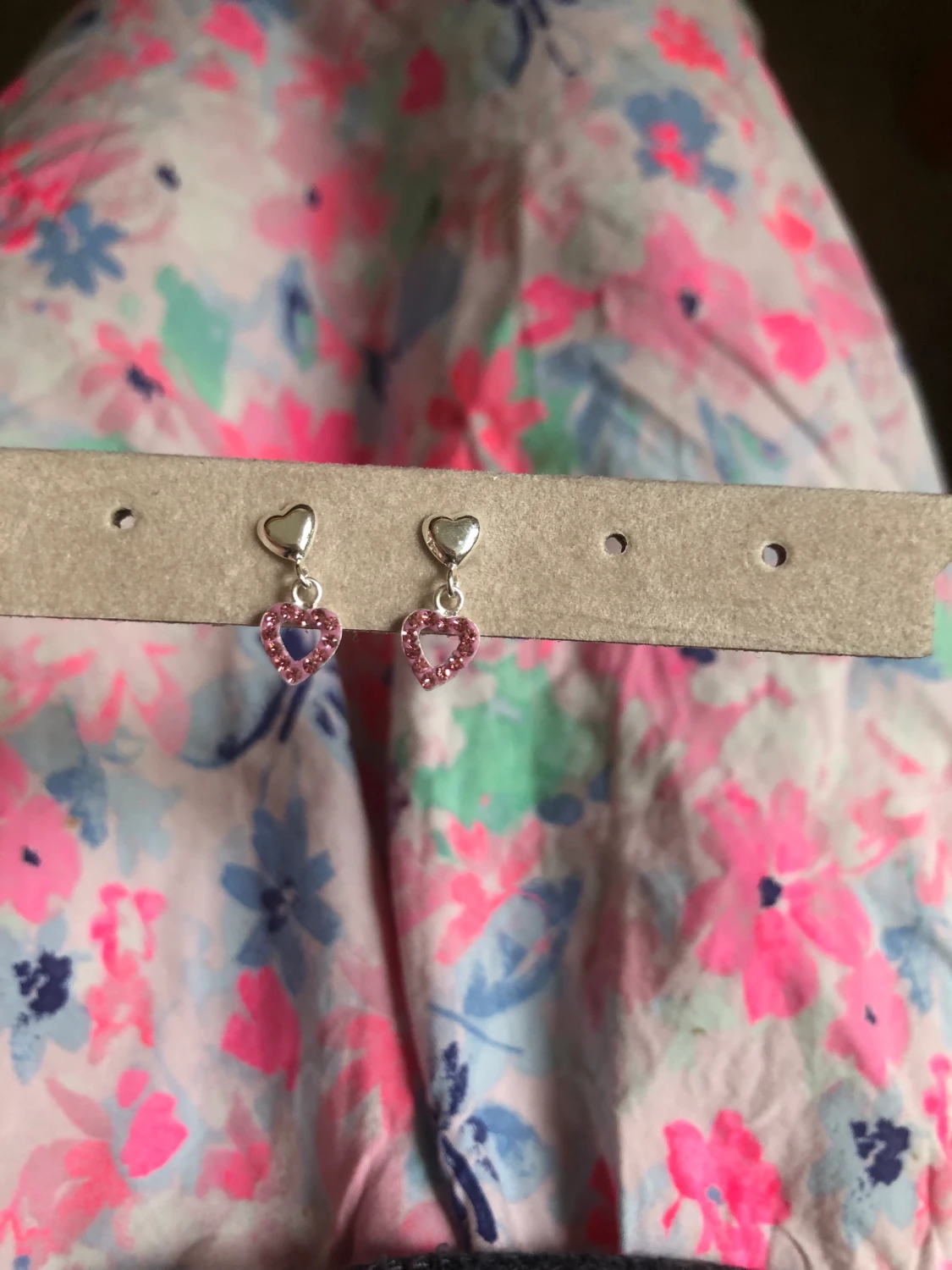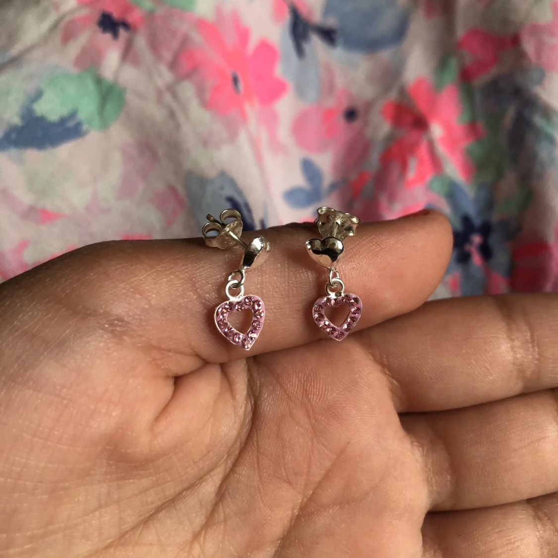 Silver örhängen aldrig använda💗. Nickelfria örhängen. Det är ett litet silver hjärta högst upp sedan hänger det ett större rosa hjärta nedanför med små stenar i.💗💎