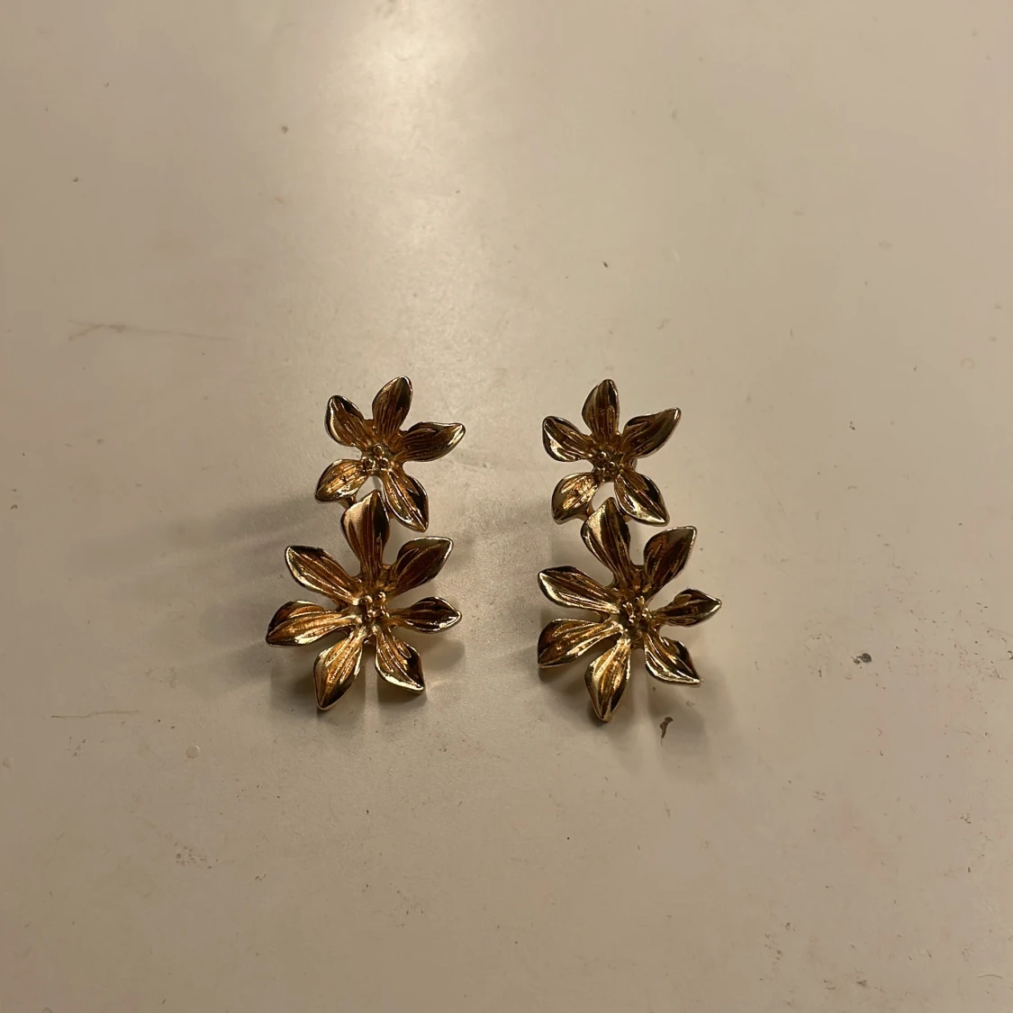 Snygga örhängen i guldton med dubbla blommor på varje örhänge. De har en cool, tredimensionell design där varje blomma har sex blad och en glansig finish. Perfekta för att ge din look en extra touch av stil. Tvättar självklart av dem innan jag skickar dem 💓