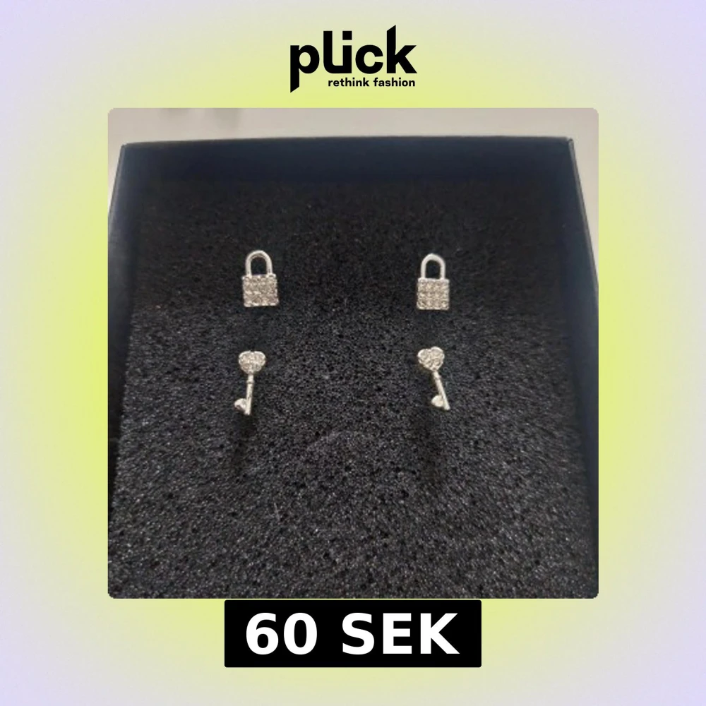 Charmiga örhängen i silverfärg med ett unikt design av lås och nyckel. Låset och nyckeln är dekorerade med små glittriga stenar för extra bling.🔐