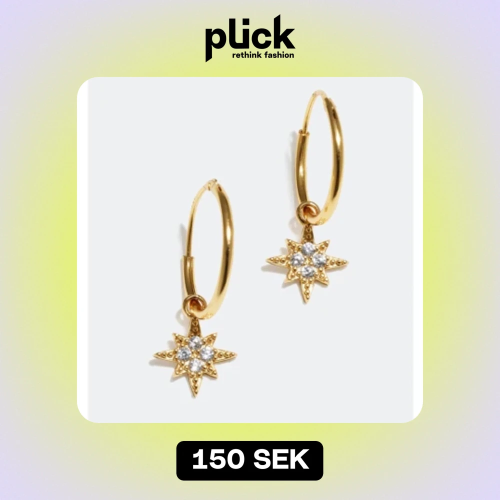 Helt nya, i 18k guldplätering. Ord.pris 249kr, säljer för 100kr. BESKRIVNING: Creoler i äkta silver, dekorerad med hängande stjärna och små cubic zirconia glasstenar. De guldfärgade är förgyllt silver med ett lager av 18 karat guld.