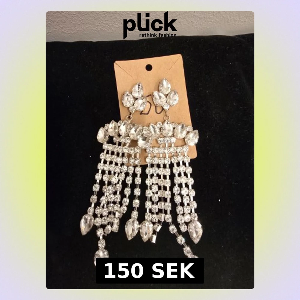 Bilden visar ett par glittriga örhängen med hängande strassdetaljer, men ingen väst finns med.