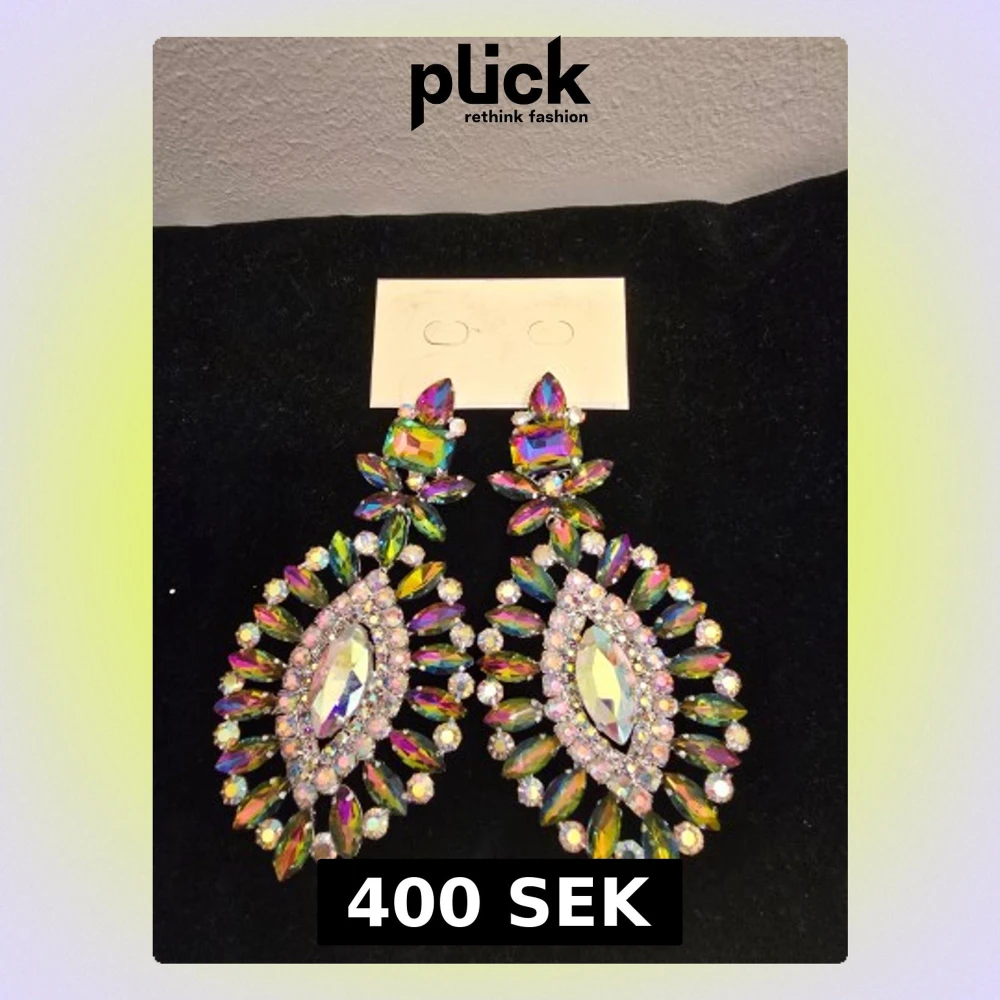 Bilden visar ett par stora, glittriga örhängen med färgglada stenar i regnbågens färger och gnistrande detaljer. Ingen väst syns på bilden.