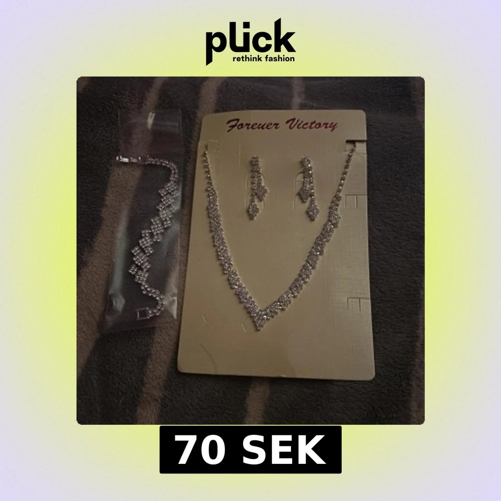 Snyggt smyckeset med halsband, armband och långa örhängen i silverfärg. Alla delar är täckta av glittrande stenar i ett mönster som ger extra bling. Perfekt för dig som vill sticka ut med en lyxig och glittrig look.