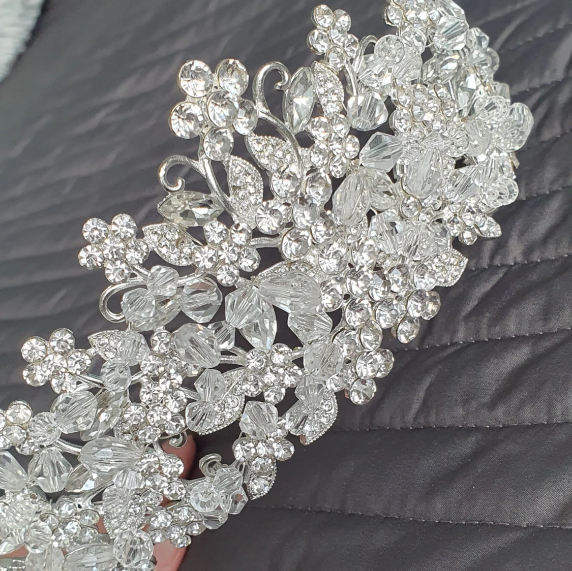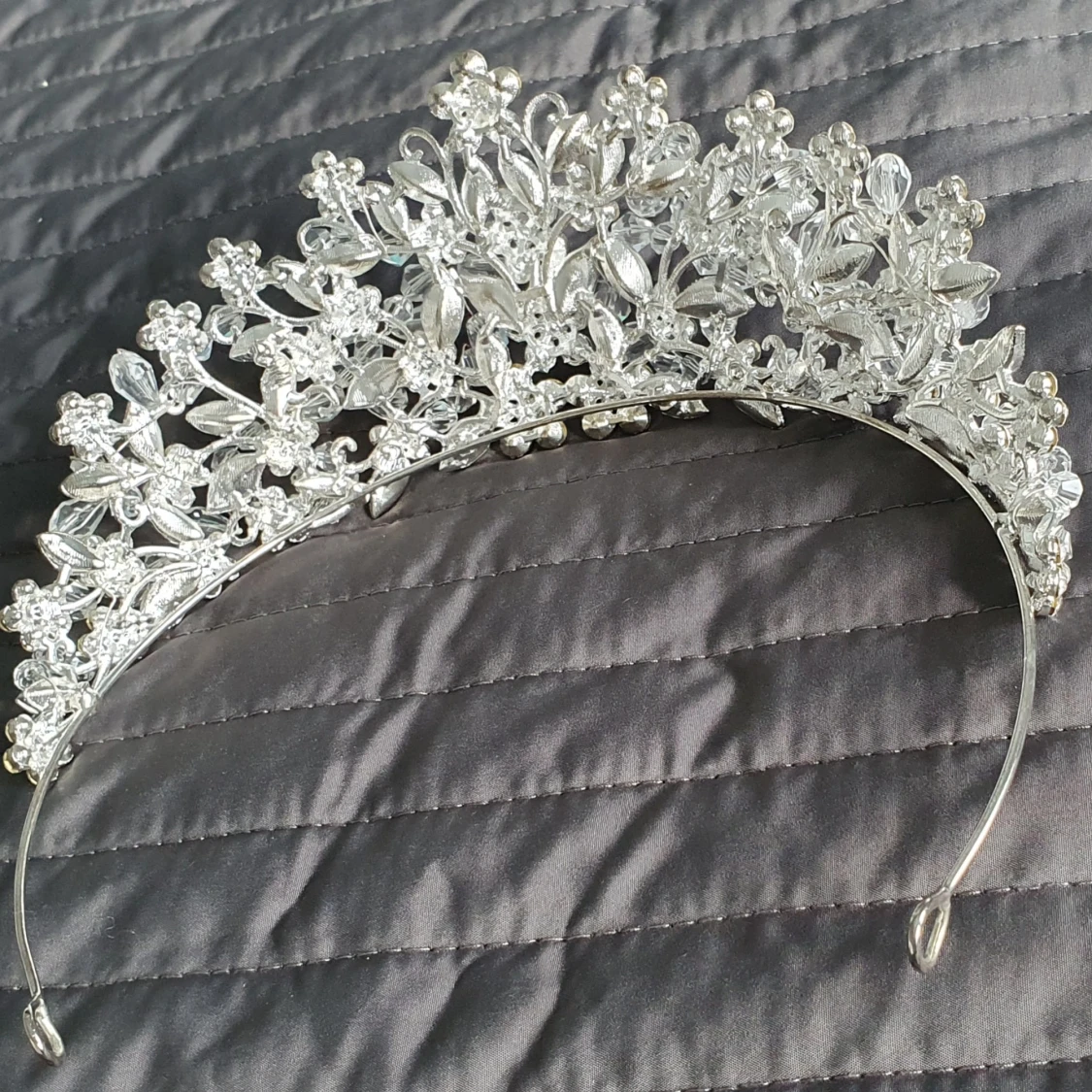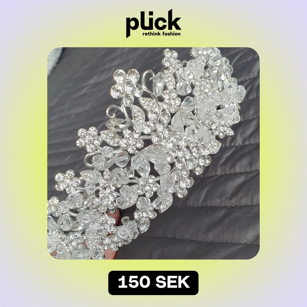 Säljer ett fantastiskt glittrigt diadem med vackra pärlor och detaljer. Perfekt för fest eller speciella tillfällen. Diademet har en elegant design med blommönster och är i en skimrande silverfärg. Det är både stilrent och iögonfallande, vilket gör det till ett måste för att komplettera din look.