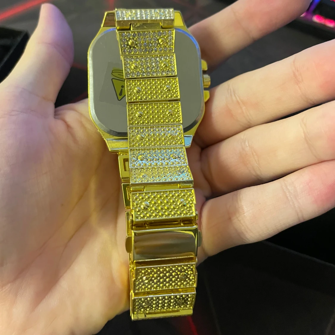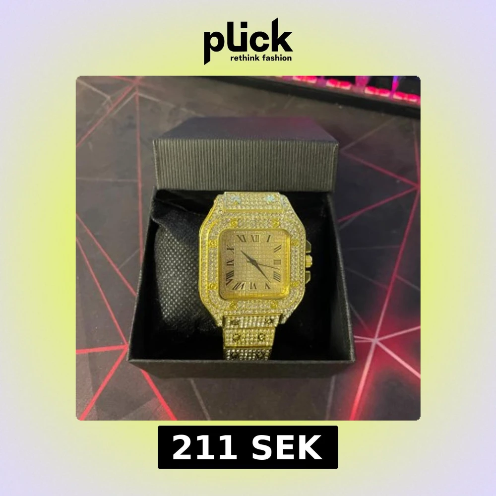 Säljer en riktigt blingig guldfärgad klocka med fyrkantig urtavla och romerska siffror. Klockan är täckt av glittrande stenar både på boetten och armbandet, vilket ger en lyxig och iögonfallande look. Perfekt för dig som vill sticka ut och gillar detaljer som verkligen syns.