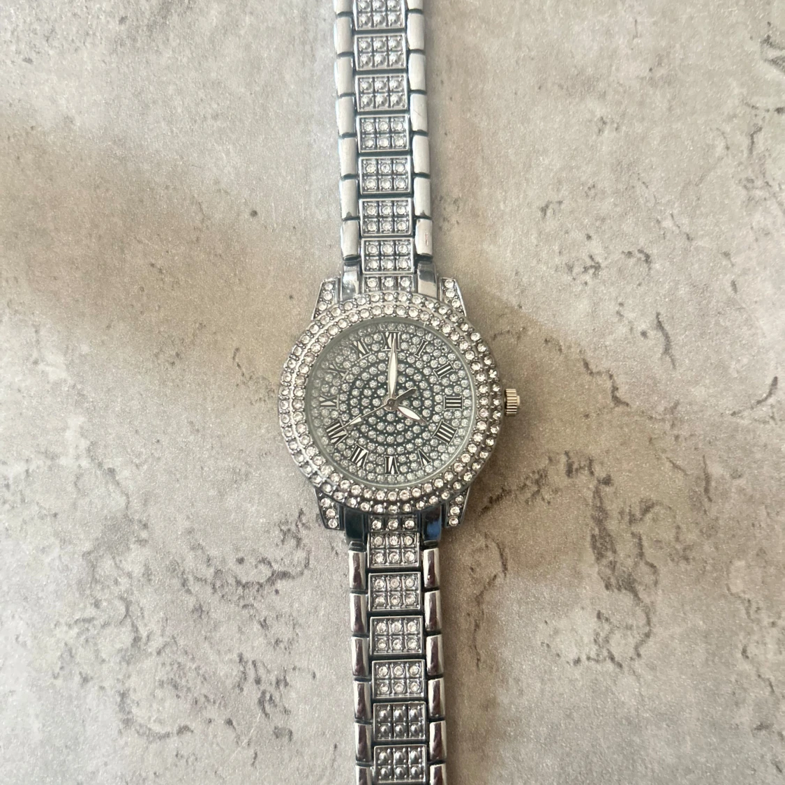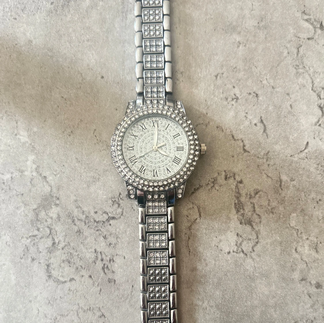 Säljer en riktigt snygg klocka i silverfärg med massor av glittrande stenar både på urtavlan och armbandet. Urtavlan har romerska siffror och hela klockan har en lyxig vibe. Perfekt för dig som gillar att sticka ut och vill ha något som blänker ordentligt. Obs inget batteri har bara använts som accessoar