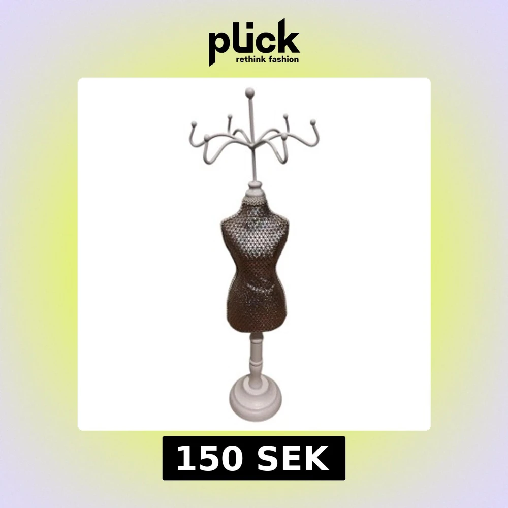 Snygg smyckeshållare formad som en kvinnlig torso med glittrigt nätmönster i silver och vit fot. Perfekt för att hänga halsband, armband och örhängen. Den har flera krokar upptill och en stabil rund fot i vitt. Väldigt liten spricka i träet som knappt syns i helhet väldigt bra skick😻