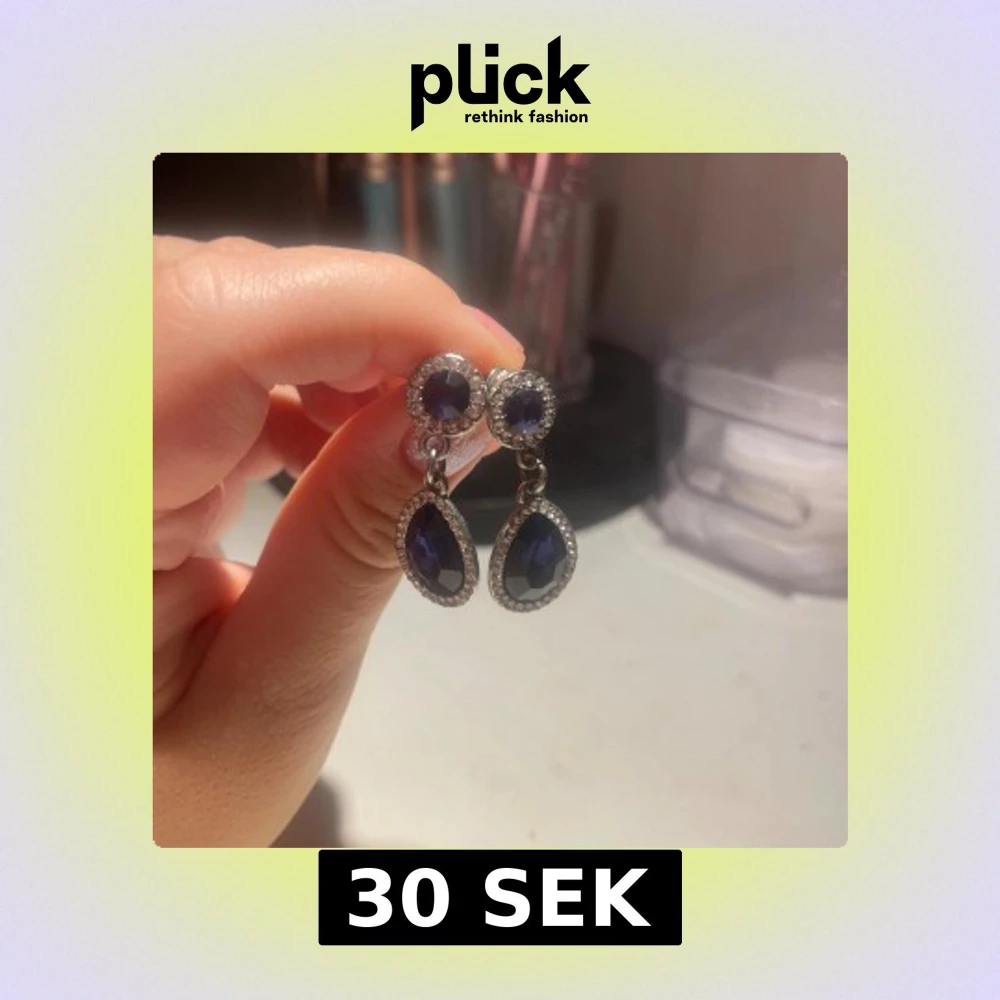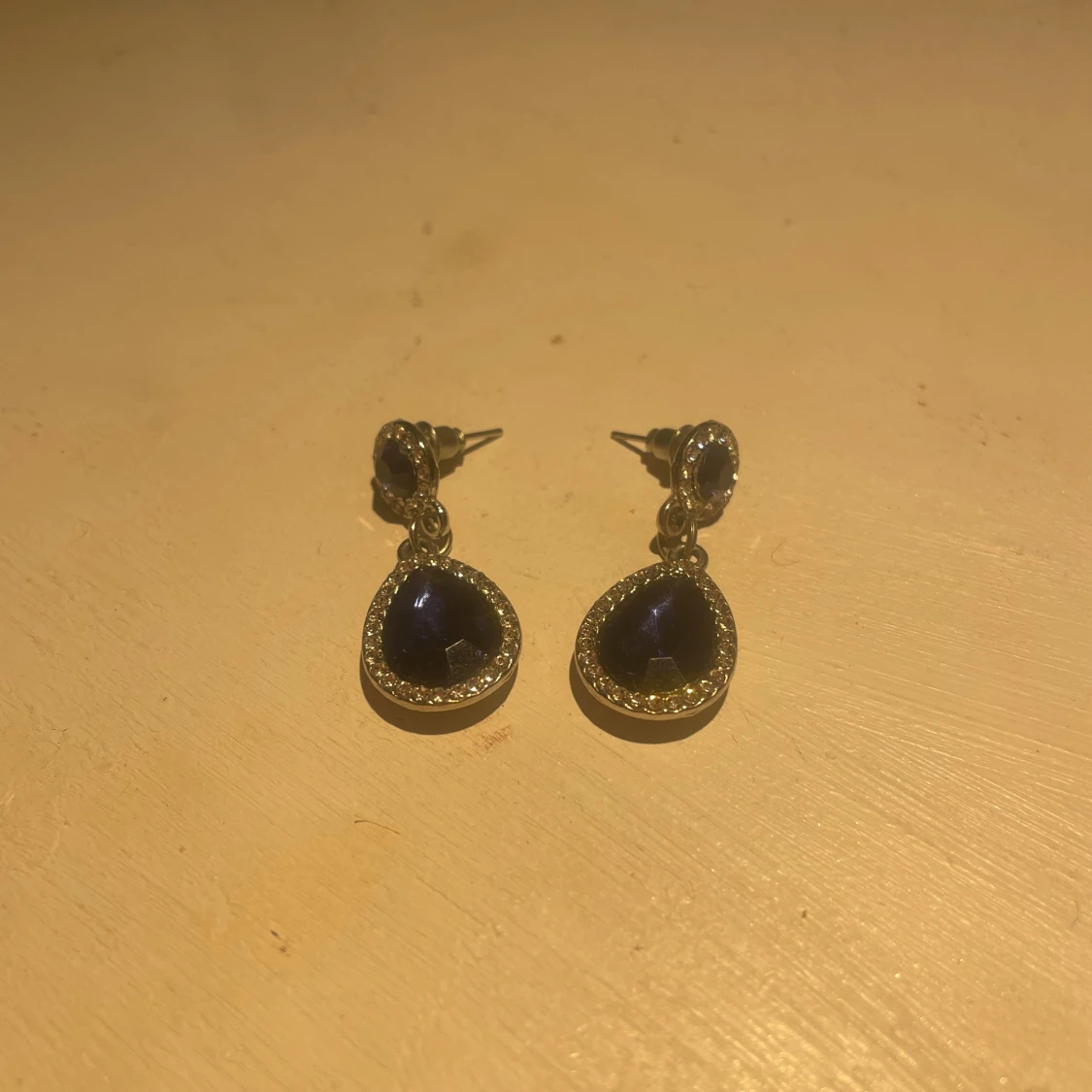Snygga örhängen med droppformade mörkblå stenar och glittriga stenar runt om. Örhängena har en silverfärgad bas och hängande design som ger extra bling. Perfekta för att lyfta din look med lite extra glam.