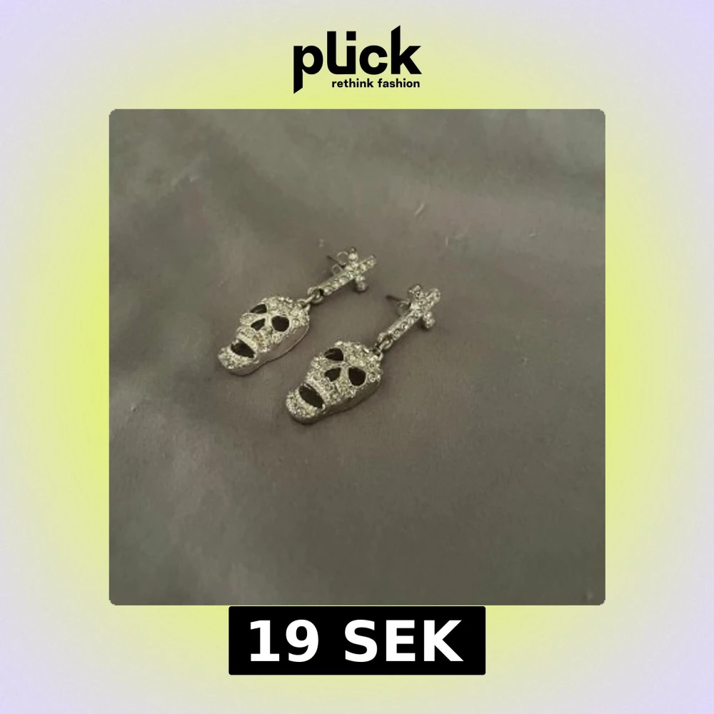 Säljer ett par coola örhängen i silverfärg med glittrande stenar. Hängande modell med döskalleform och kors upptill.