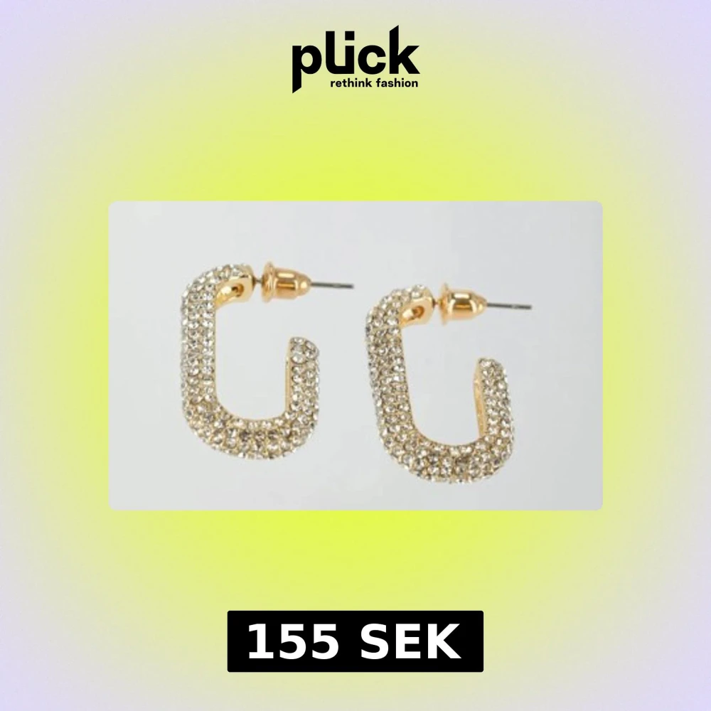 Säljer ett par chunky örhängen i guld med massor av glittrande stenar. De har en fyrkantig, böjd form och är perfekta för att ge din look extra bling. Örhängena har stift och är riktigt statement med sin glittriga yta.